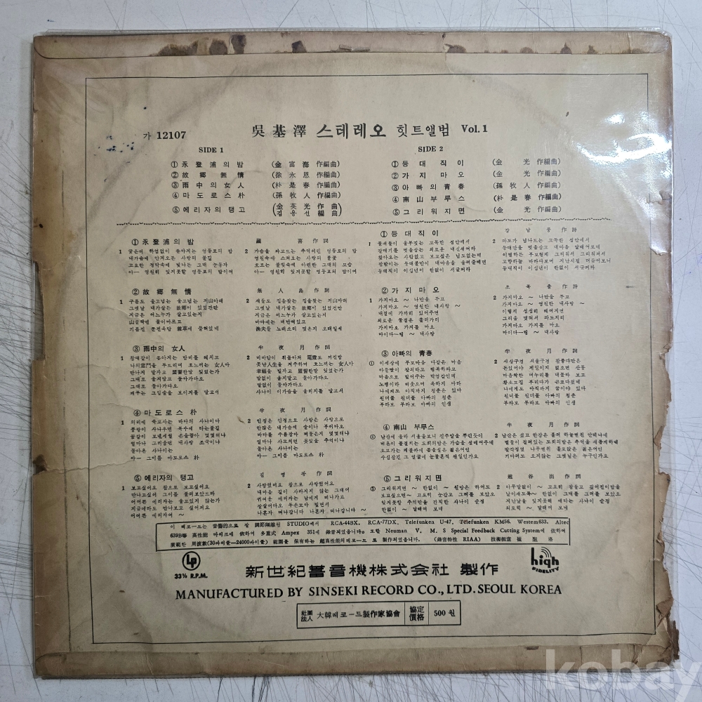 | 자켓상태 | VG : 주름, 접힘, 모서리 찢김 다수 | 음반상태 | VG : 생활 기스 다수, 가벼운 노이즈 존재 | 발매정보 | 초반 | 가사지여부 | 무 |