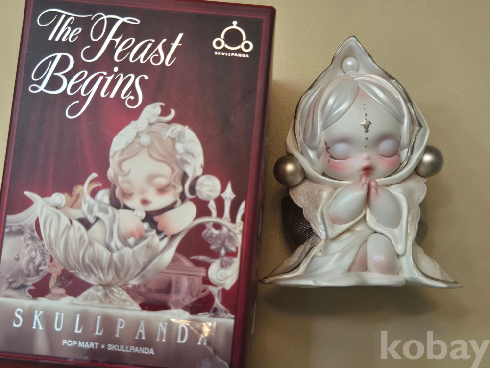 이 피규어는 팝마트(POP MART)의 '스컬판다 만찬의 서막(Skullpanda The Feast Begins)' 시리즈 중 '에그 컵(Egg Cup)'으로 보입니다.