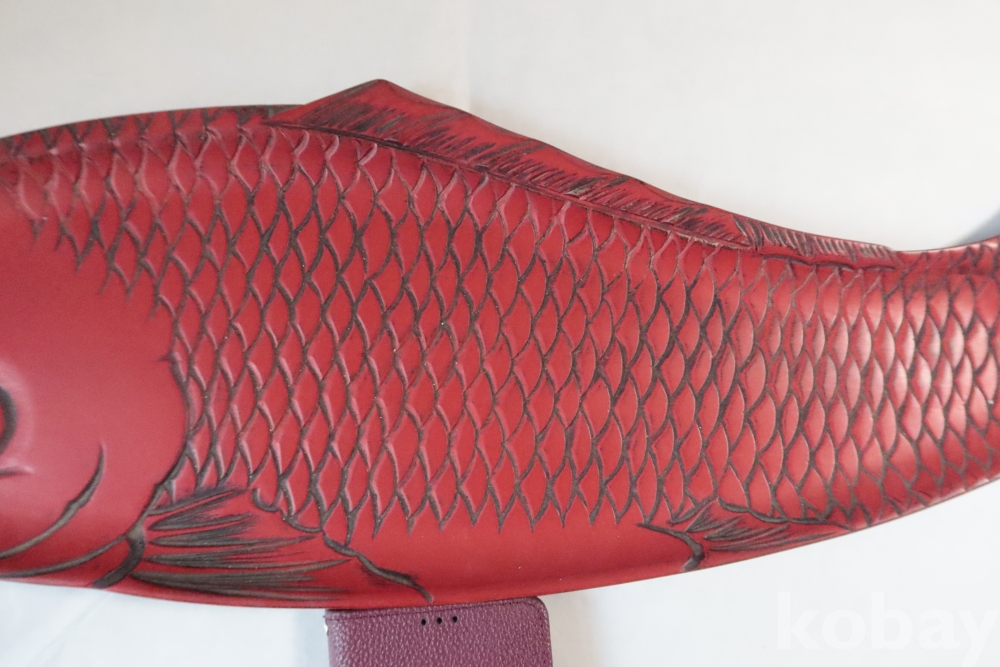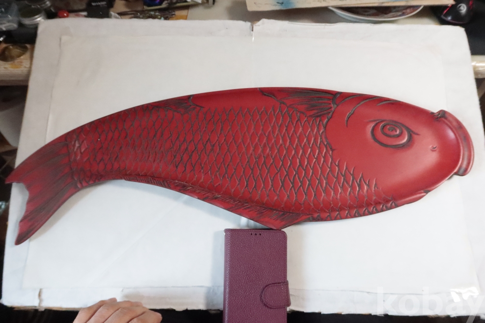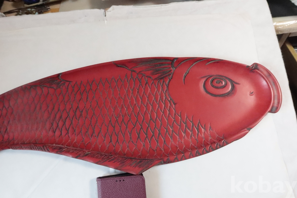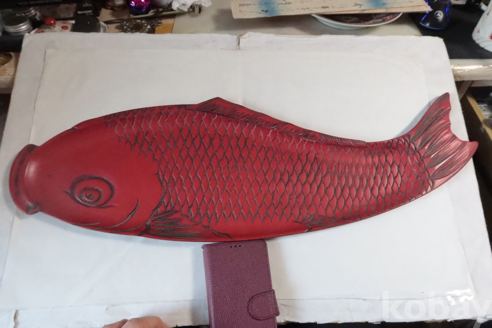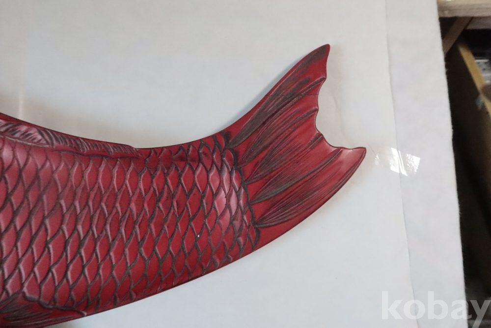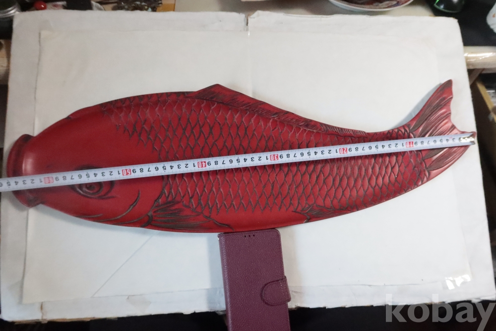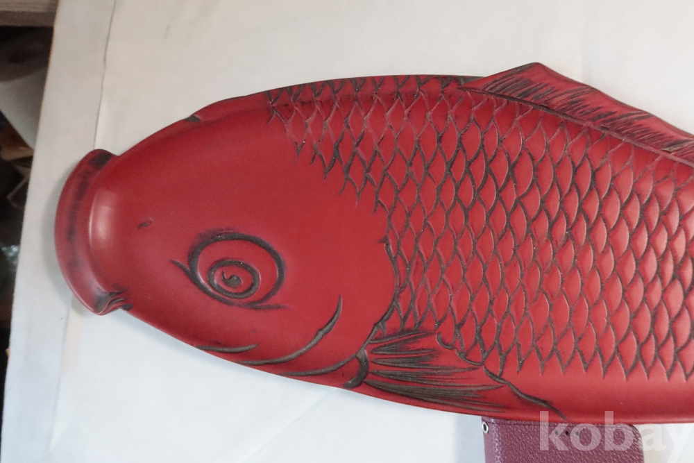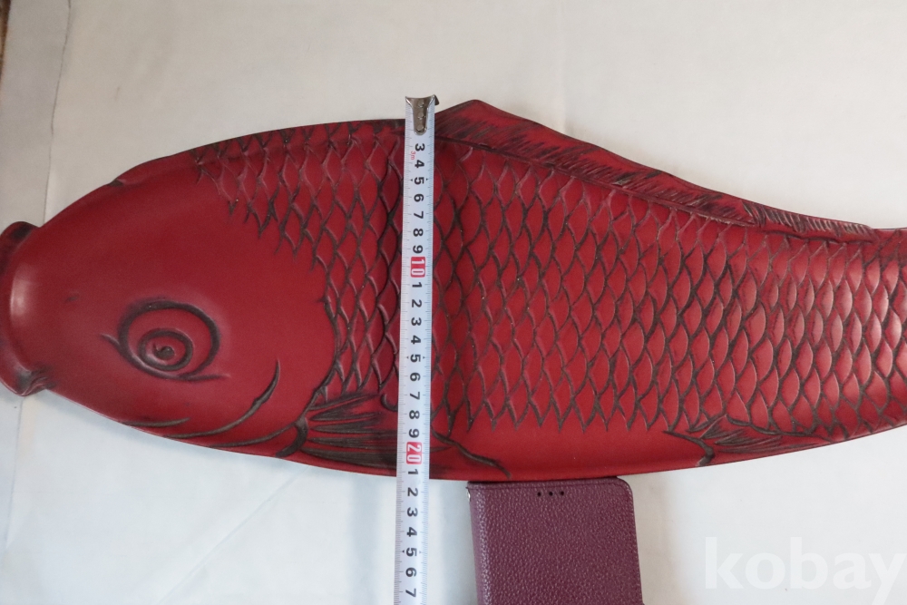 나무 칠기 우루시 잉어 임니다 멋진 디자인 조각되어진 칠기 이며 꼬리 부분은 제살?붙침이 보이는 가볍고 단단한 나무 칠기 임니다 극히 귀한 명품 나무 공예 임니다