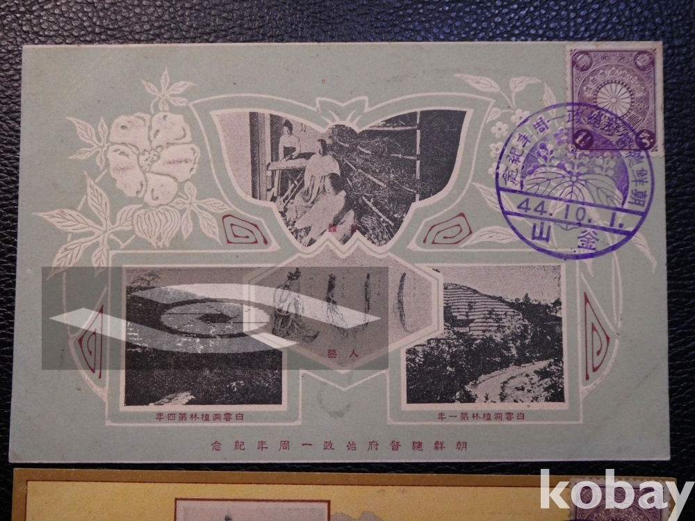 ▣설명: 전체 30여 매 시리즈. 조선총독부는 1910년 이래 매년 10월 1일이면 이른바 시정기념엽서(始政記念葉書, 1920년부터는 5주년 단위)를 발행했다. 조선총독부가 출범하여 식민지 조선에 대한 통치를 처음 펼친 날이 바로 10월 1일이었으므로 이를 기념하려는 목적이었다. 화려한 색채와 다양한 디자인이 어우러진 이 고급 엽서들은 조선의 문화 유산이나 자연풍광을 비롯해 조선 각 지방의 산업 발달 또는 중요한 역사적 사건 등을 디자인 소재로 삼았다. ‘시정기념’이란 말에 걸맞게 이 엽서들은 식민지 지배의 정당화를 넘어 총독부의 선정(善政)에 의해 미개한 조선이 비약적으로 문명개화했다고 내외에 선전하는 홍보수단 노릇을 톡톡히 했다. 실제 매년 발행된 기념엽서는 대부분 조선 전 분야가 일제에 의해 비약적으로 발달한 것처럼 묘사 하거나, 낙후된 과거 모습과 일제에 의해 ‘근대화된’ 모습의 사진을 나란히 배열하여 한눈에 비교하기 쉽게 디자인되었다. 일제의 대한제국 병탄을 한국인들이 기뻐하고 환영한 것처럼 디자인한 후안무치한 엽서들도 있다. 의도적인 상징 조작과 합성을 통해 그들은 조선인의 실상과 관련이 없는 허구의 ‘낙토(樂土) 식민지’를 이미지로 창출한 것이다.