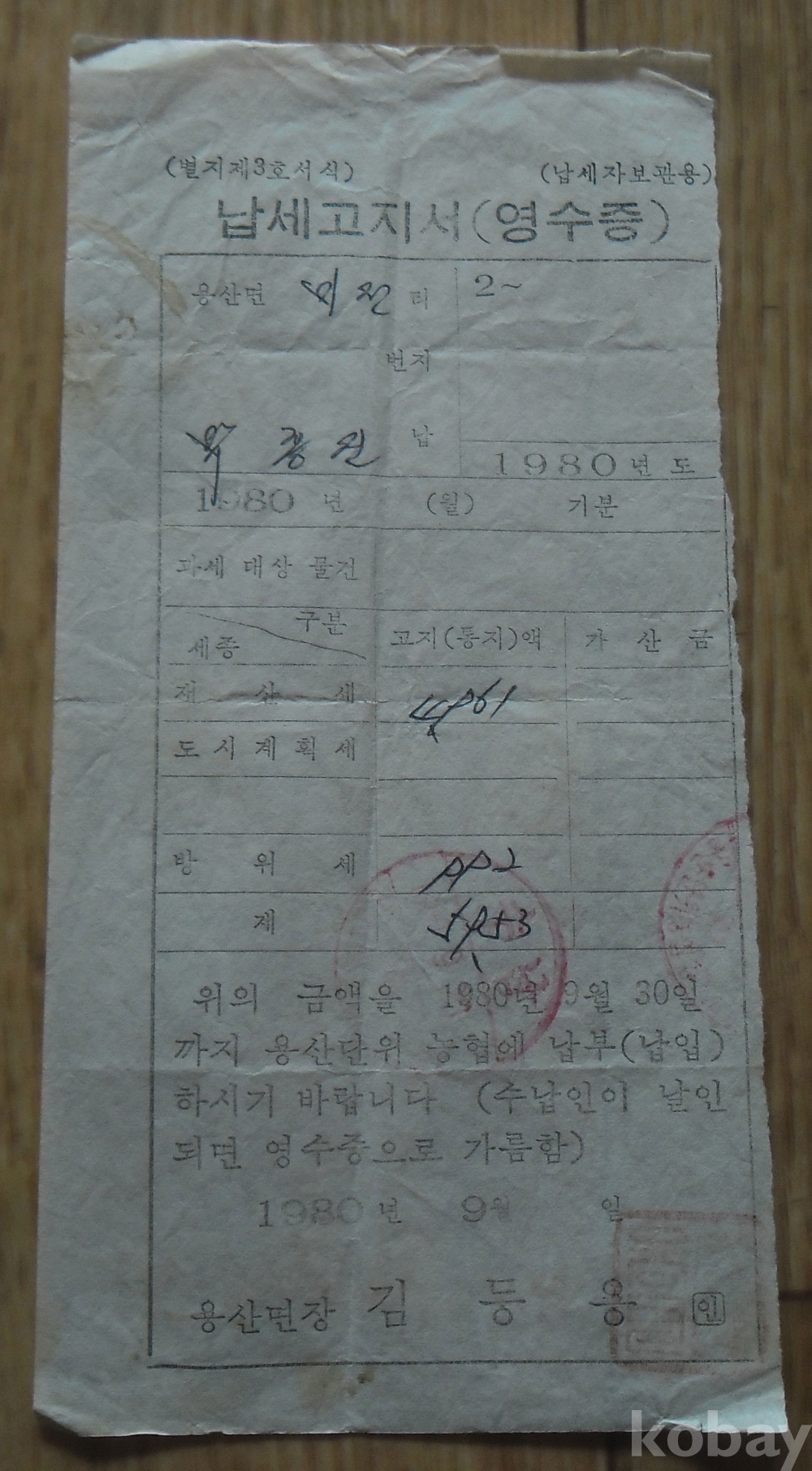 1980년 영동군용산면 재산세 납세 영수증