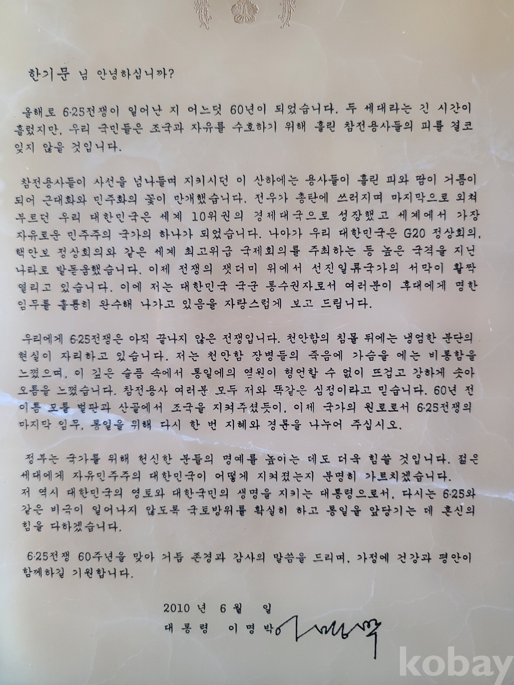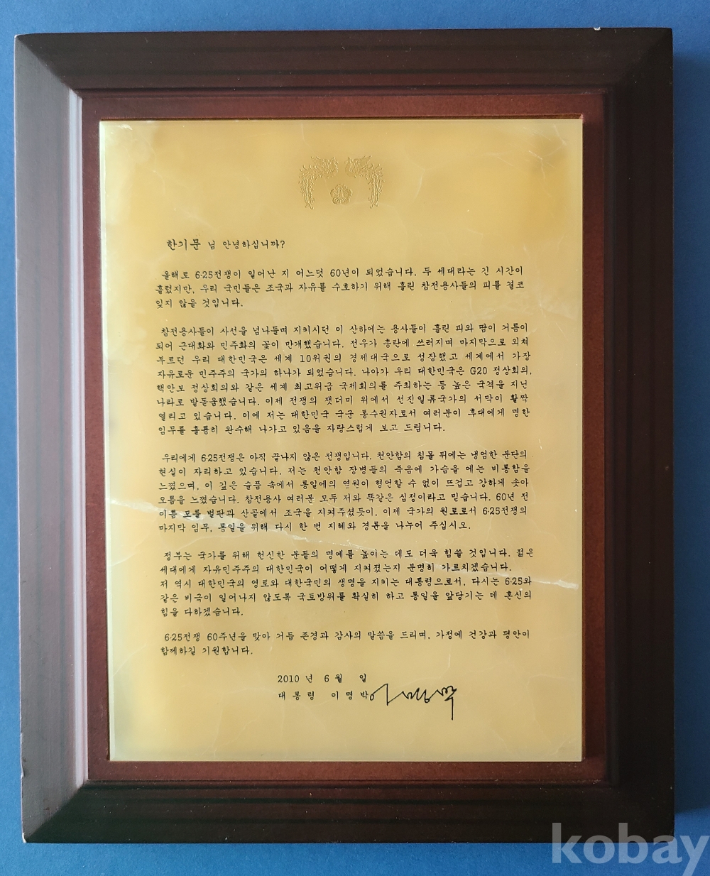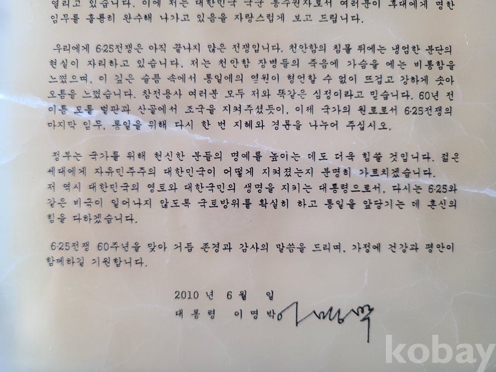 2010년 6.25전쟁 60주년을 맞이하여 대통령 이명박이 증정한 기념패