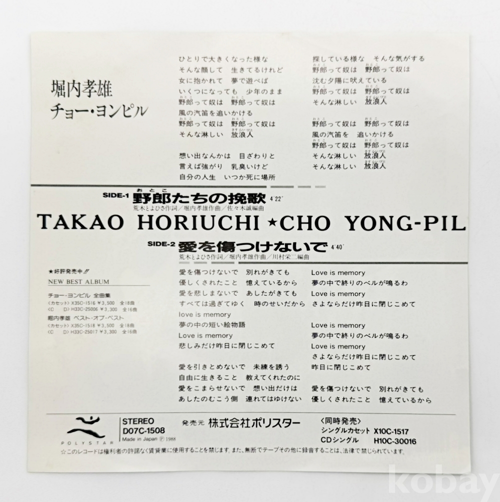 상품명 | 조용필, 후리우치 타카오 일본 싱글 [ 남자들의 만가 / 사랑을 상처입히지 말아요 ] 7인치 LP | ||
