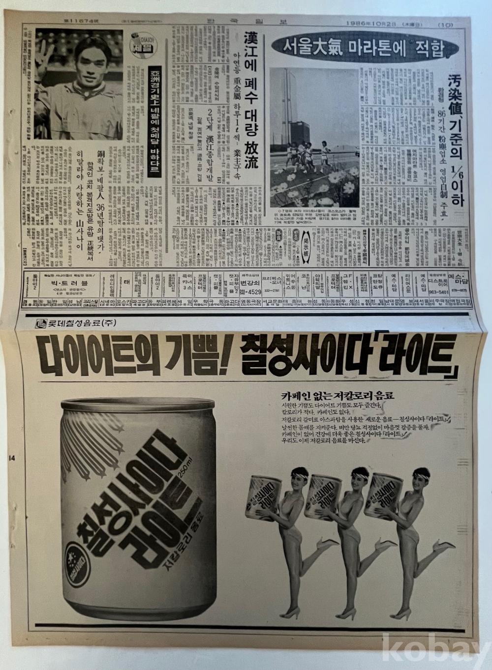 칠성사이다 신문광고가 실린 1986년 한국일보 신문 낱장입니다.
