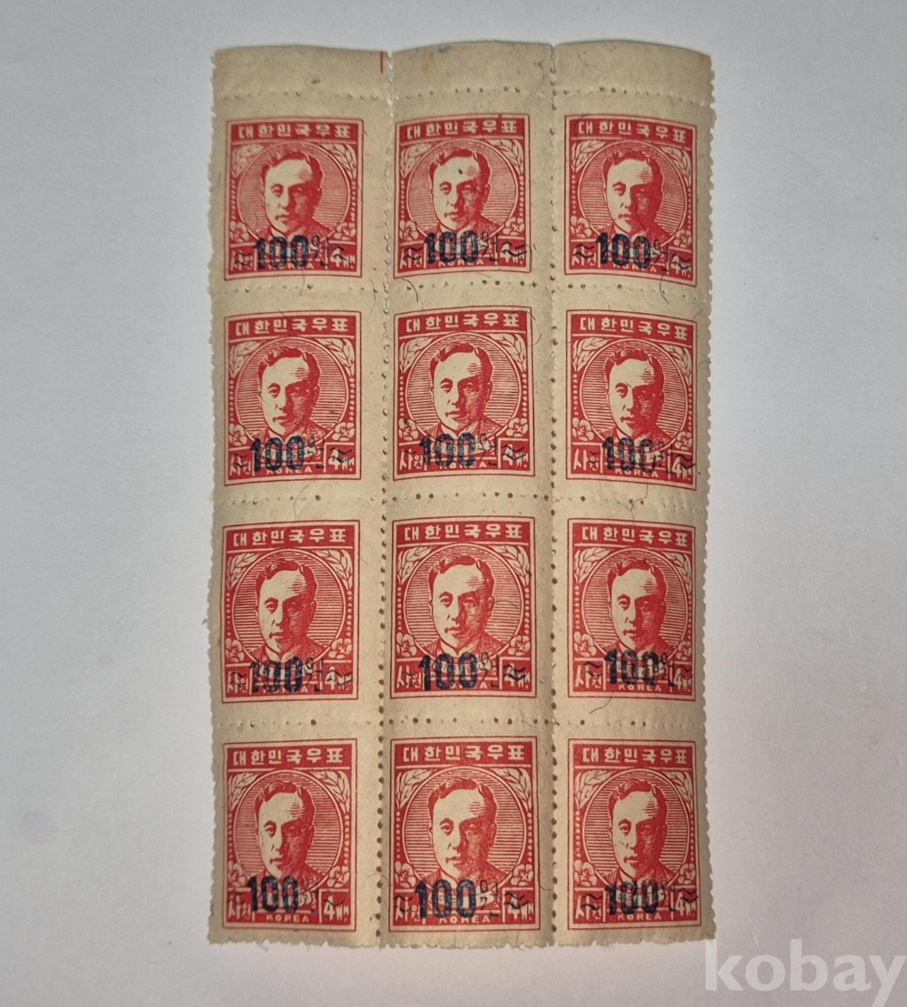 1951년 발행된 '전시첨쇄 이준열사 보통우표 100/4원' 12매 블럭입니다.