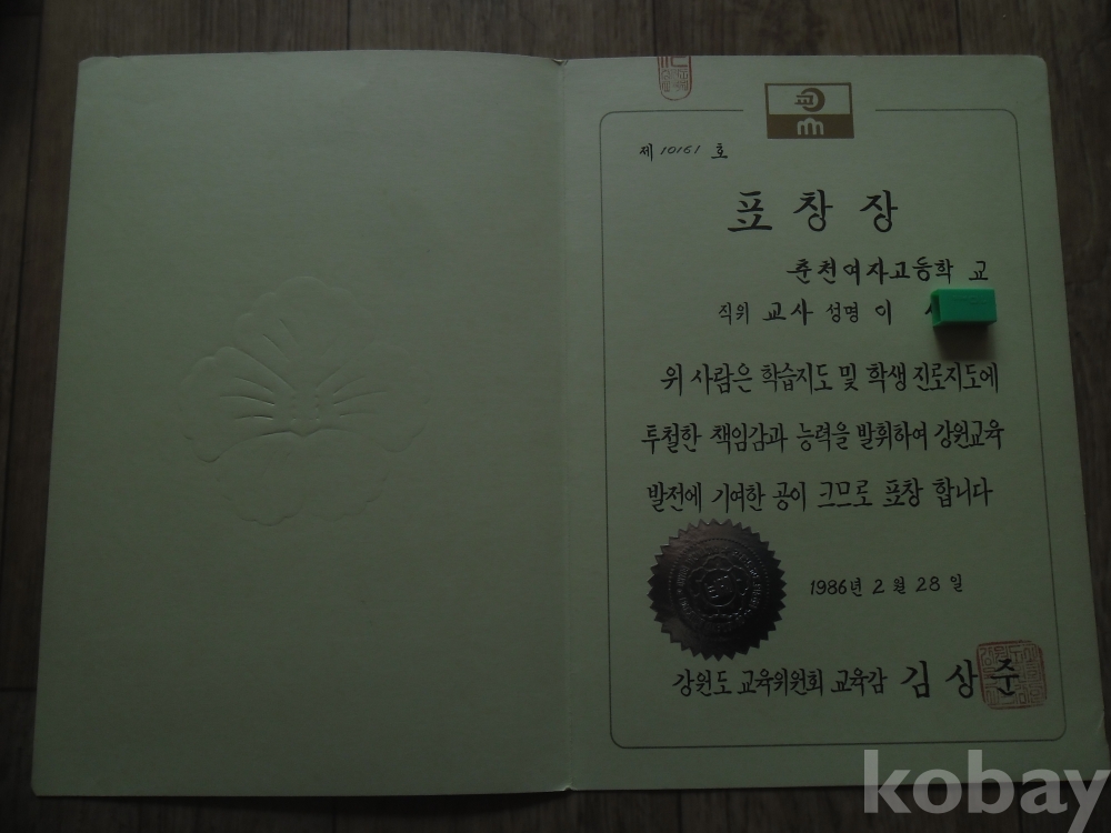 1986년 강원도 교육감 표창장
