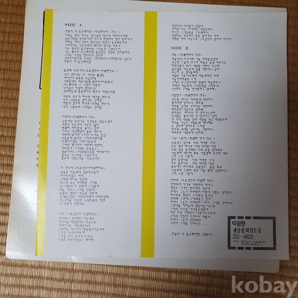 | 자켓상태 | EX : 약간의 마모, 모서리 찢김 존재 | 음반상태 | NM : 개봉했으나 미사용급, 스크래치 없음 | 발매정보 | 알수없음 | 가사지여부 | 유 |