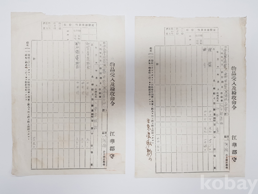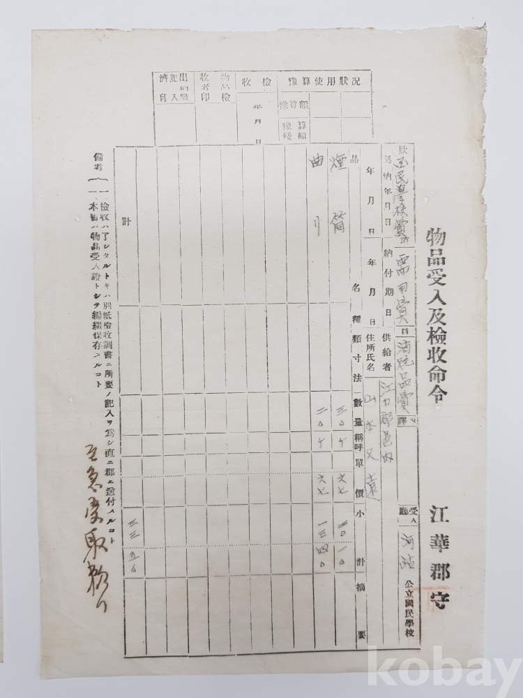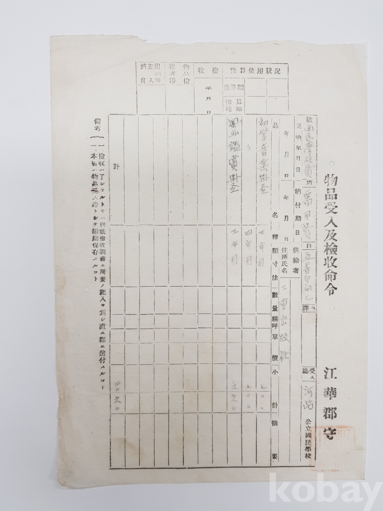 일제강점기 物品受入及檢收命令 (江華郡守) 2점*하점공립국민학교로 보낸 문서