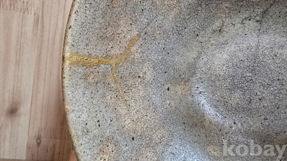 [수리 흔적] 사진에서 확인하실 수 있듯이, 기물에 '금수리(킨츠기)' 수리 흔적이 있습니다.