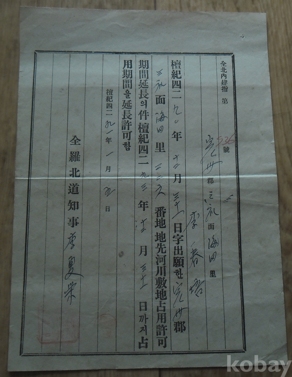 1957년 하천부지점용허가 연장 허가서(전북)