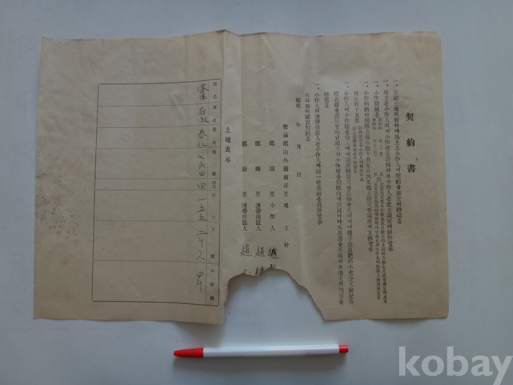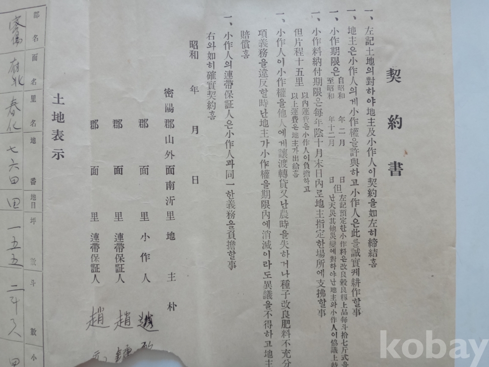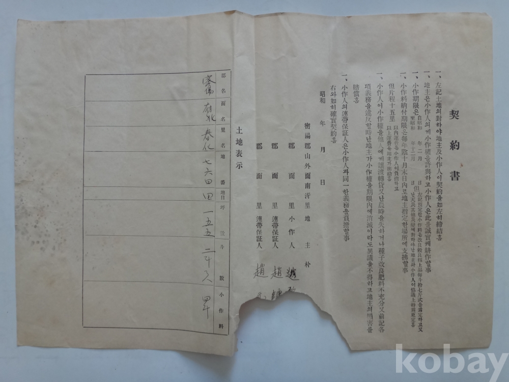 소작 계약서 (소화년간, 밀양군 산외면..)