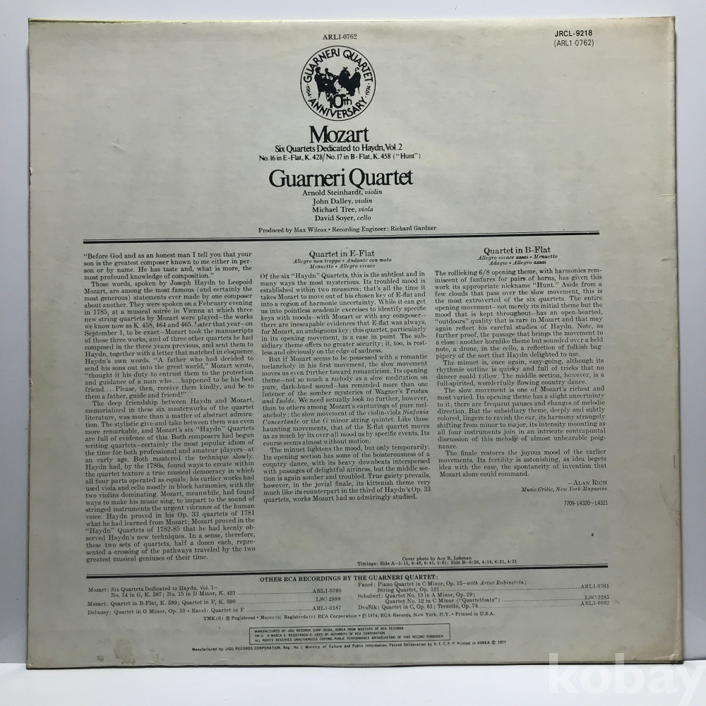 LP 360-12 Mozart Guarneri Quartet 가르네리 4중주단 자켓 EX+ 알판 NM 77 년 국내반