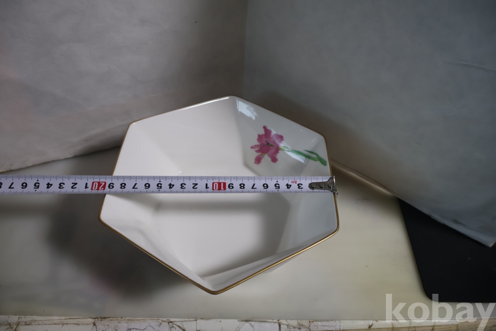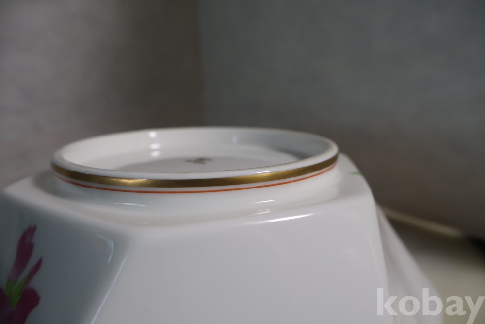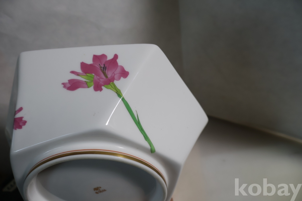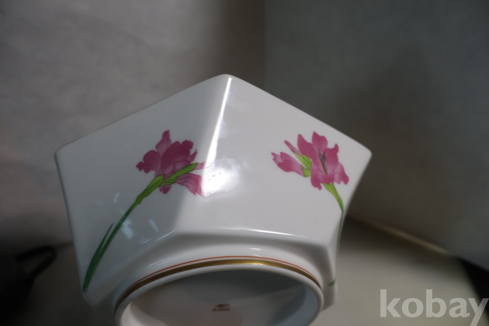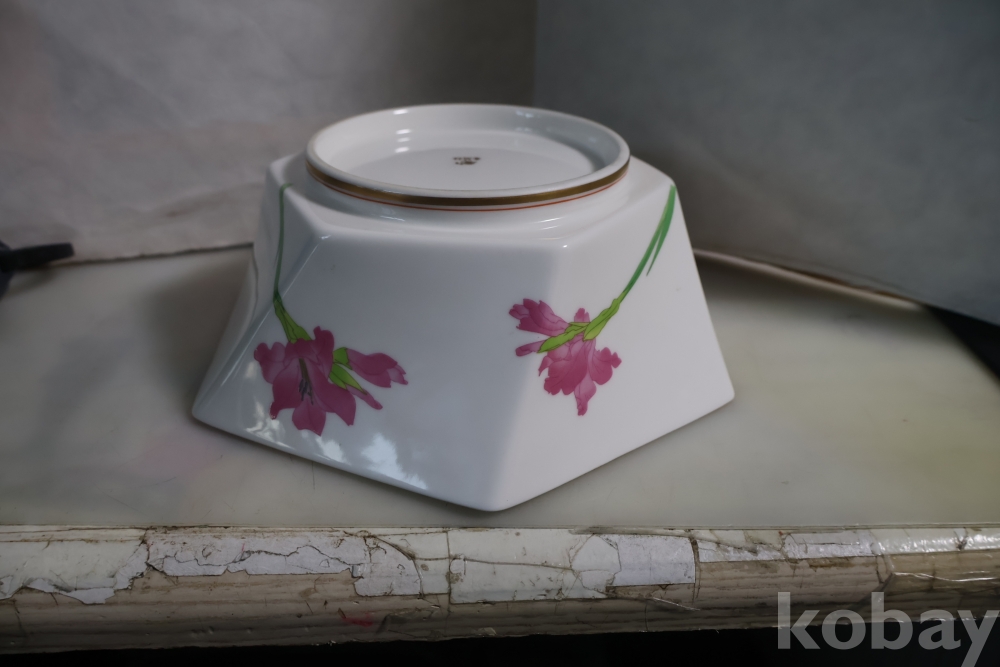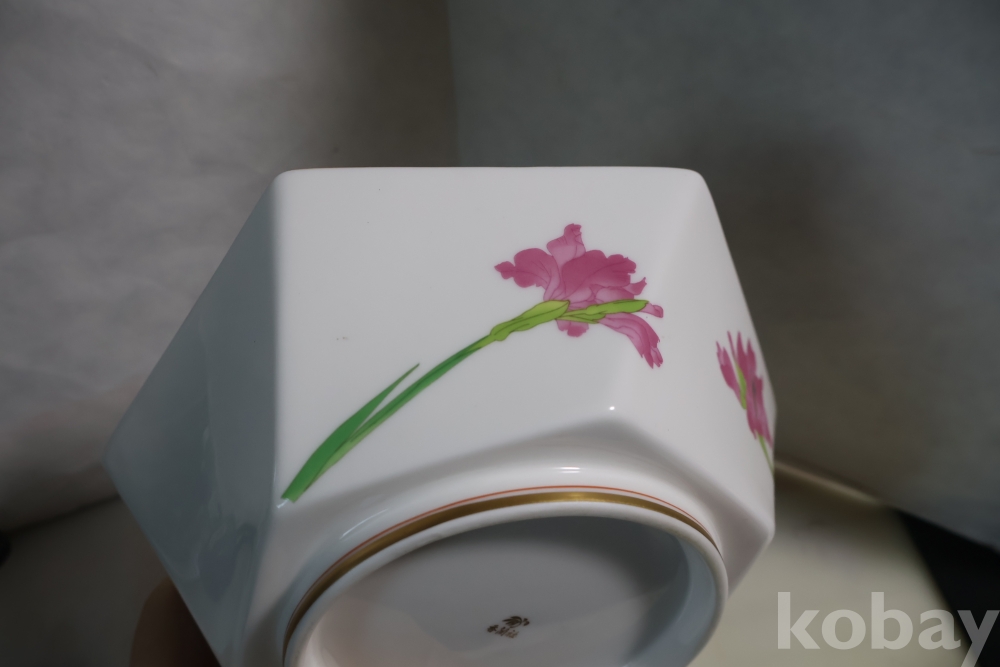 각형 도자기 임니다 특히 일반 적인 각형이 아니라 틀어서? 휘어지게 만든 특이한 디자인을 가진 명품 임니다 코란샤 특유의 문양 과 단순 정교한 명품 임니다 1960대 이후 작 높이8 입술의 금색 처리 등등 최고급 도자기 무개감이 대단 함니다 두터운 명물 임니