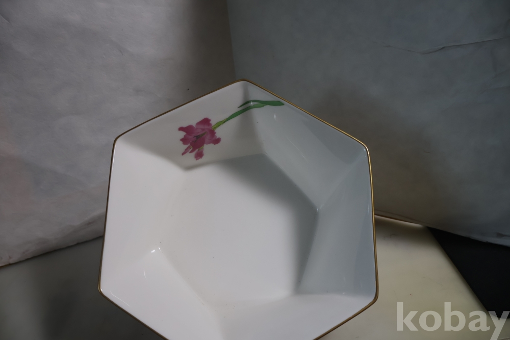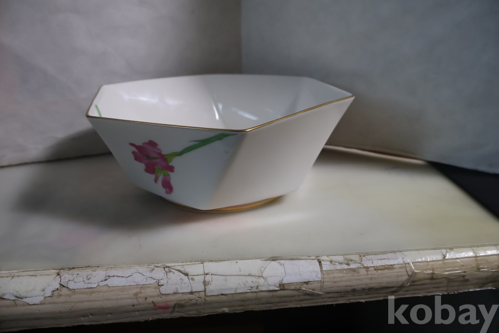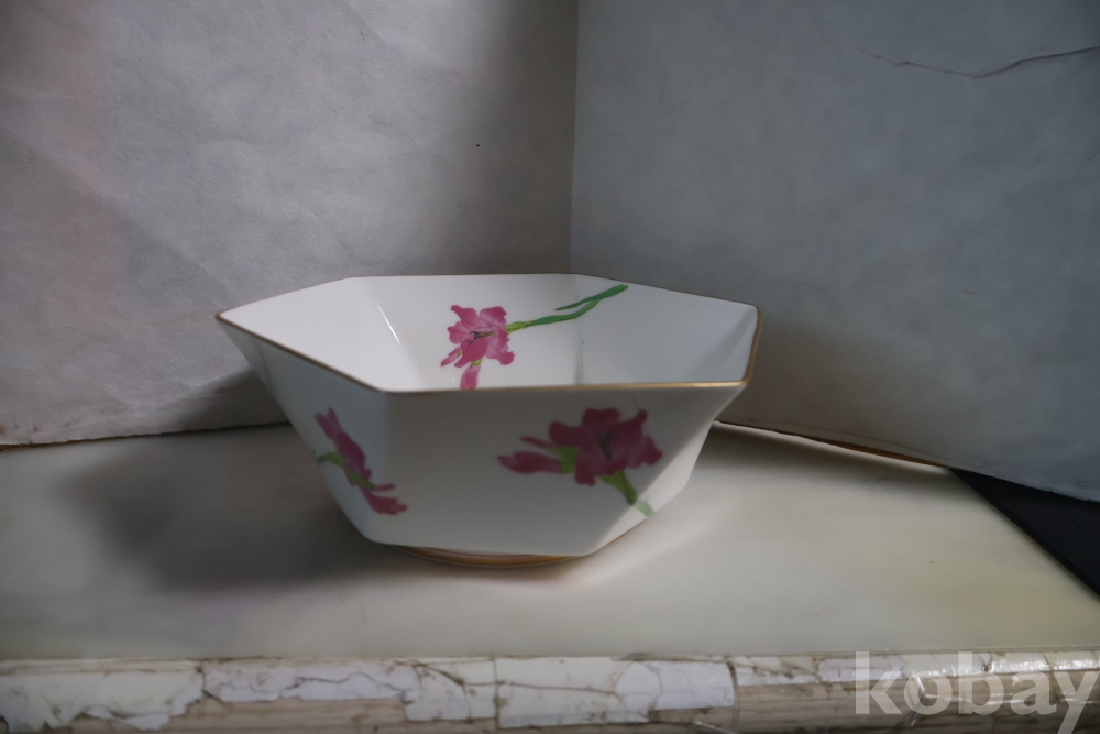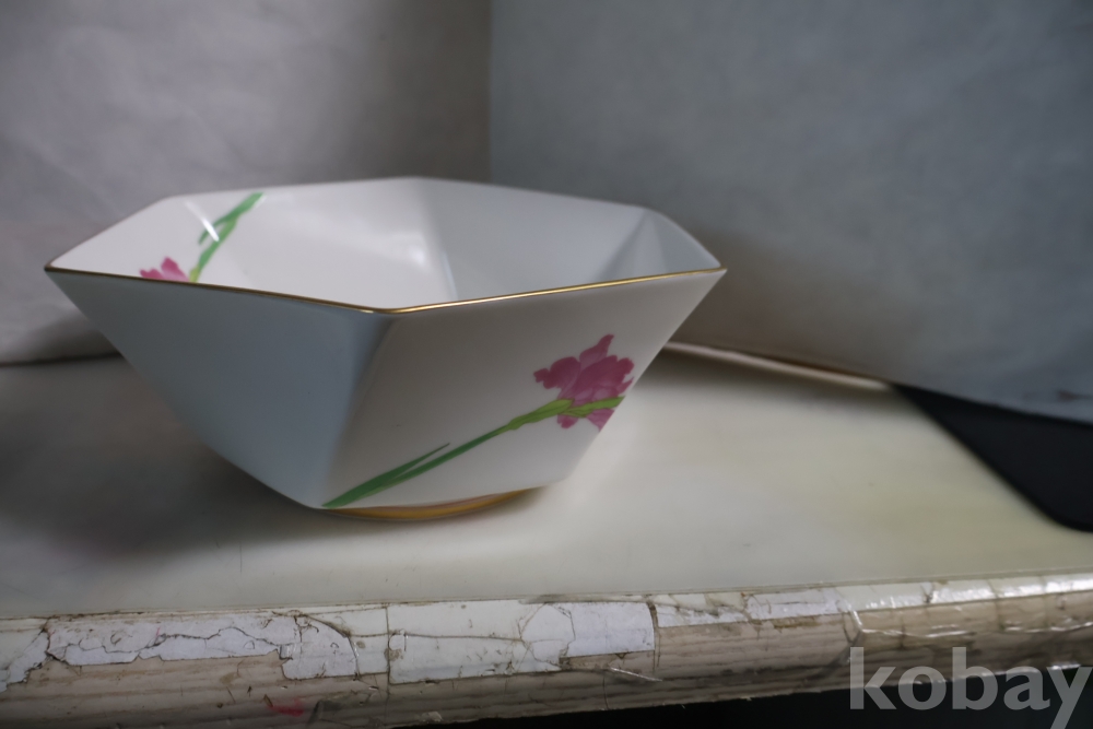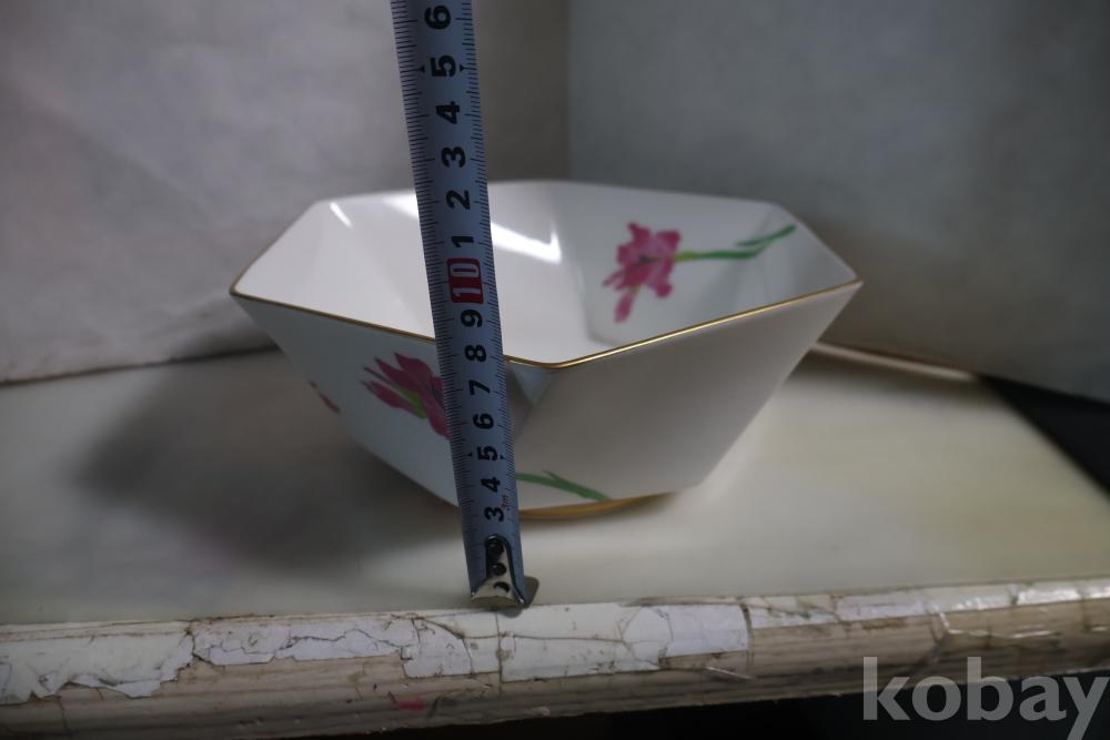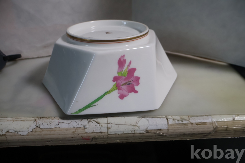 각형 도자기 임니다 특히 일반 적인 각형이 아니라 틀어서? 휘어지게 만든 특이한 디자인을 가진 명품 임니다 코란샤 특유의 문양 과 단순 정교한 명품 임니다 1960대 이후 작 높이8 입술의 금색 처리 등등 최고급 도자기 무개감이 대단 함니다 두터운 명물 임니