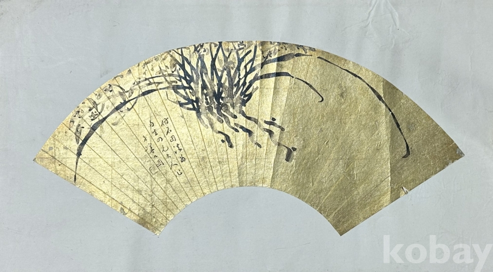본 작품은 부채형 화면 구성의 동양 회화 작품으로 금박 바탕 위에 먹선으로 자연 풍경을 표현한 장식성이 뛰어난 작품이다. 화면 중앙에는 수목과 자연의 흐름을 강조한 필선이 배치되어 있으며, 좌측에는 일본식 서체로 보이는 문구가 삽입되어 있어 전통 장식화 또는 실내 인테리어용 회화로 활용되었을 가능성이 높다. 전체적으로 금박 특유의 광택과 고급스러운 질감이 살아 있으며, 종이 재질 특성상 세월감과 자연스러운 사용 흔적이 일부 존재한다. 장식용·컬렉션용·인테리어 소품으로 적합한 작품이다.