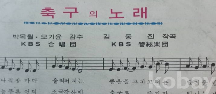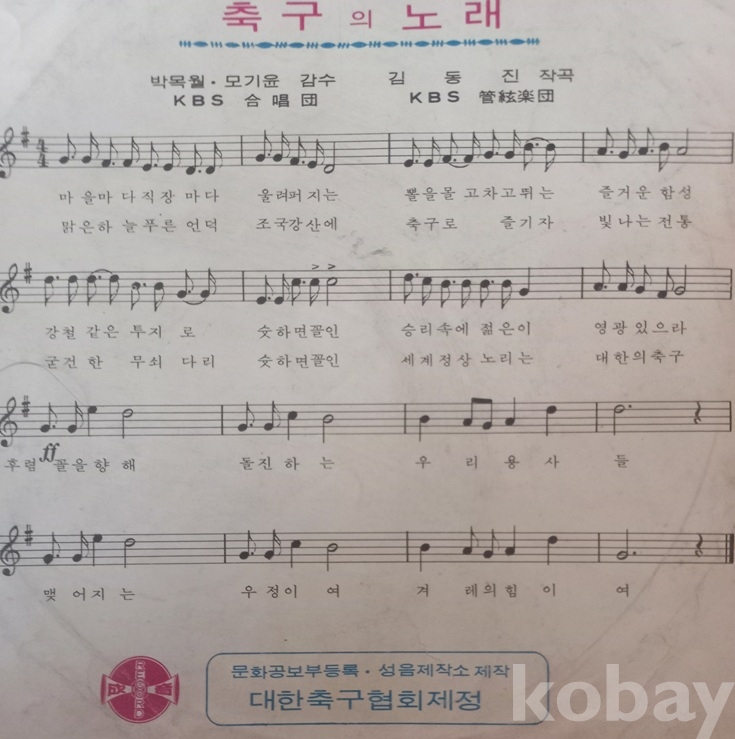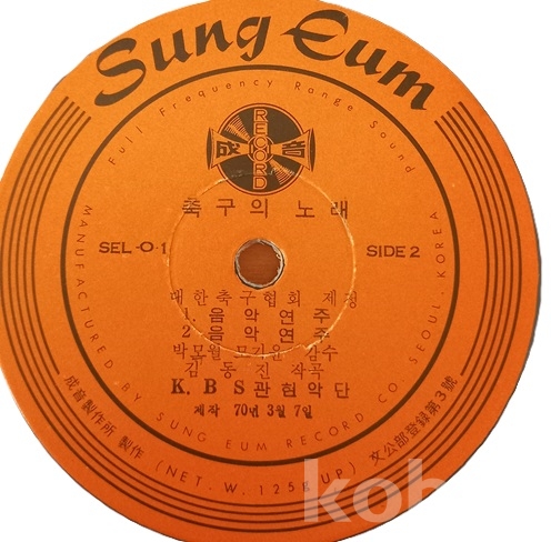 축구외 야군가 노래반이 있는것 같으나 70년도에 이 음반에 비하면 한참 뒤에 나왔다 하고.. 그러고 보면 운동경기 음반이 나온건 이게 최초일것 같읍니다. 30여년 넘게 봤지만 이 음반이 보인건 한두번이 고작인게.. 엄청 귀한것 같읍니다. 쟈켓사진이 지금은 없어진? 동대문구장이라 하고 경기도 한일전 역전골 장면이라 하고.. 전 운동에 관심이 없어서 그냥 그런가 하고.. 쟈켓과 음반 모두 세월에 비해 좋은것 같읍니다