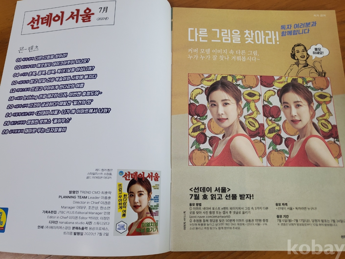 1. 선데이 서울 2020년 7월호, 이마트, 2020년, 28쪽, 월간, 비매품, 이마트 소식지, 표지 모델(배우 한다감), 상태 상, 사진 참조