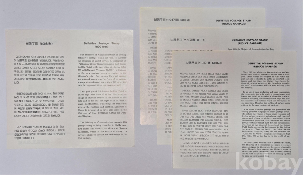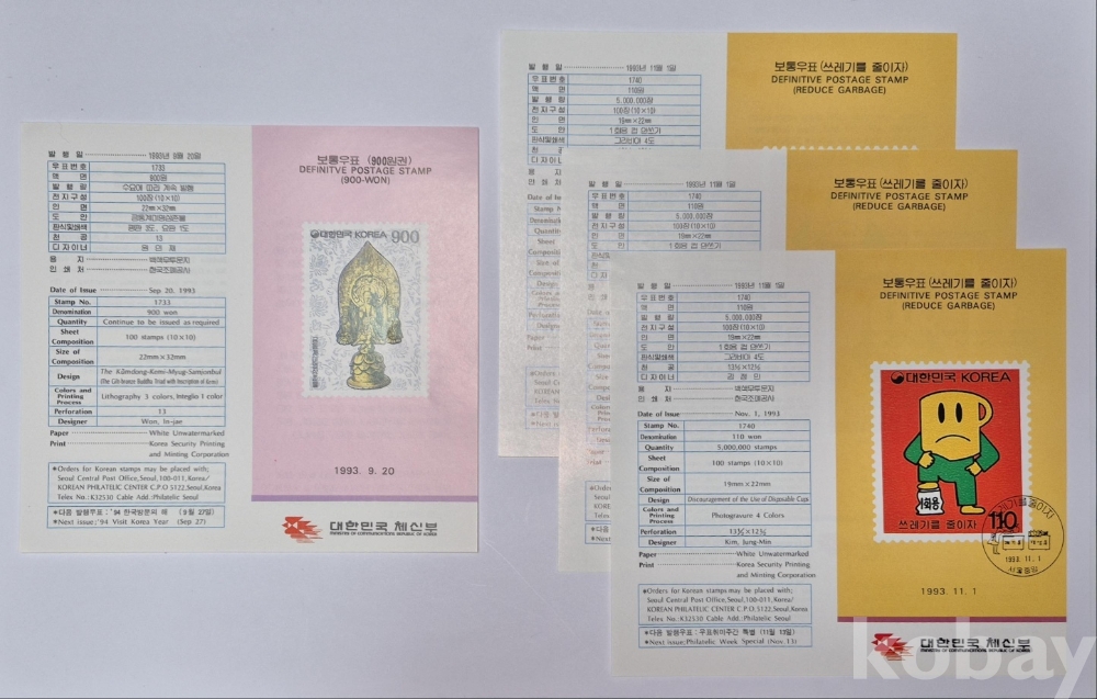 1993년 발행한 '금동계미명삼존불' 보통우표 안내카드 1매와 '쓰레기를 줄이자' 보통우표 안내카드 3매입니다.