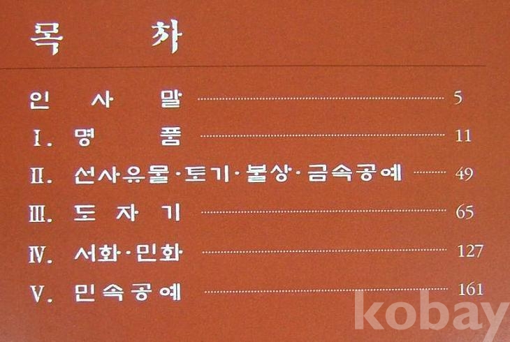 이미지의 목차처럼 명품/선사유물,토기,불상,금속공예/도자기/서화,민화/