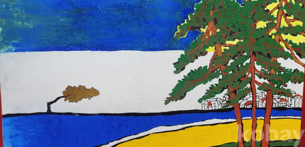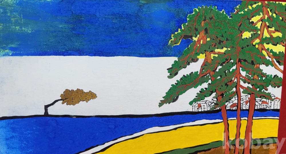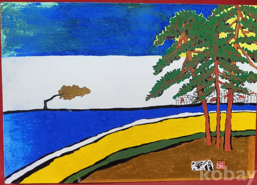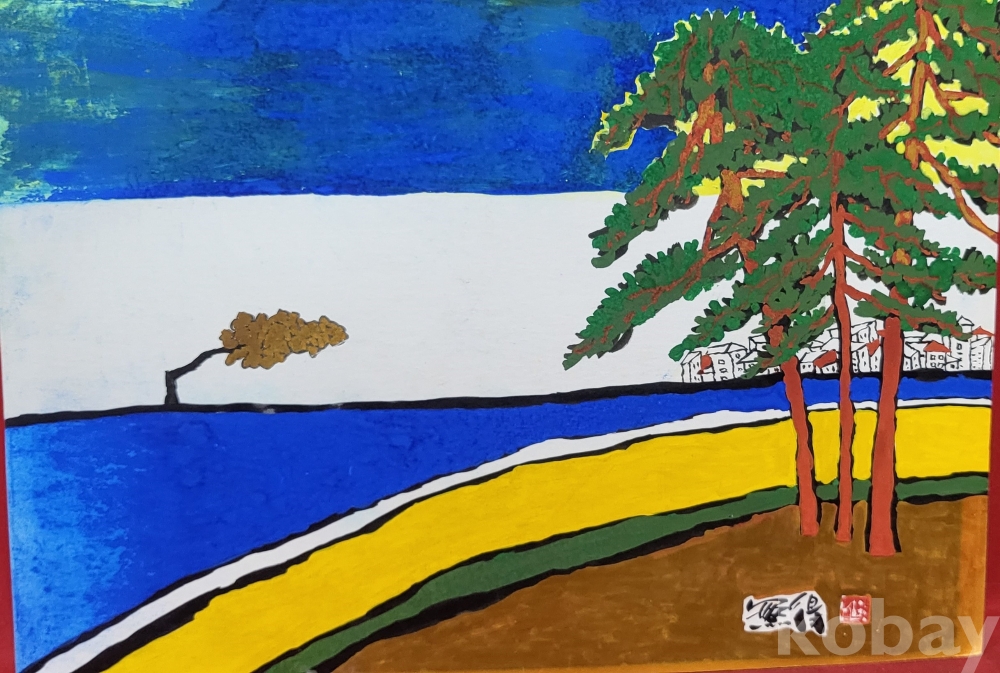 소나무와 노랑색 들판이 펼쳐진 넘어에는 푸른 강이 흐르는 풍경화입니다,