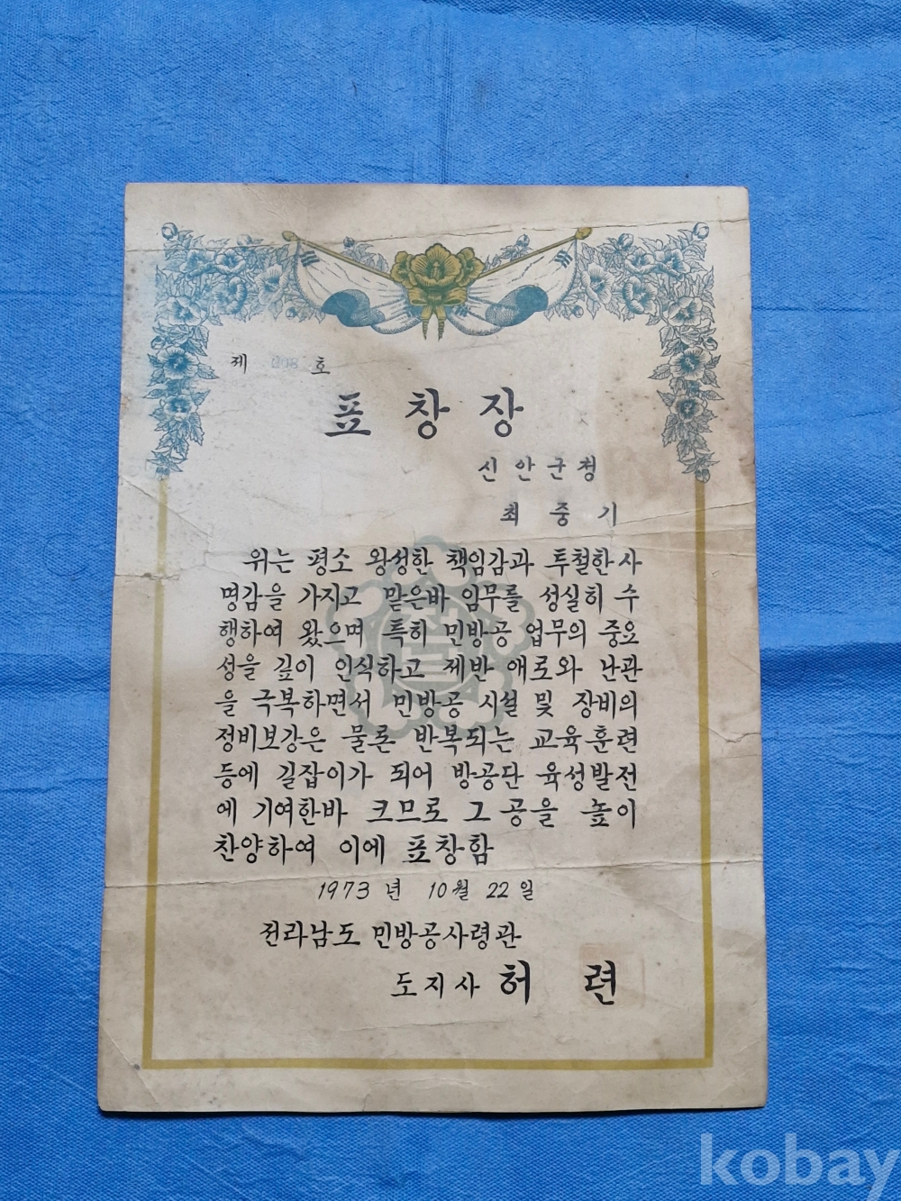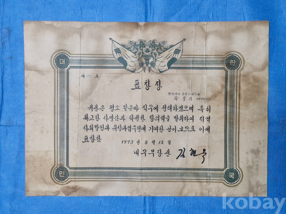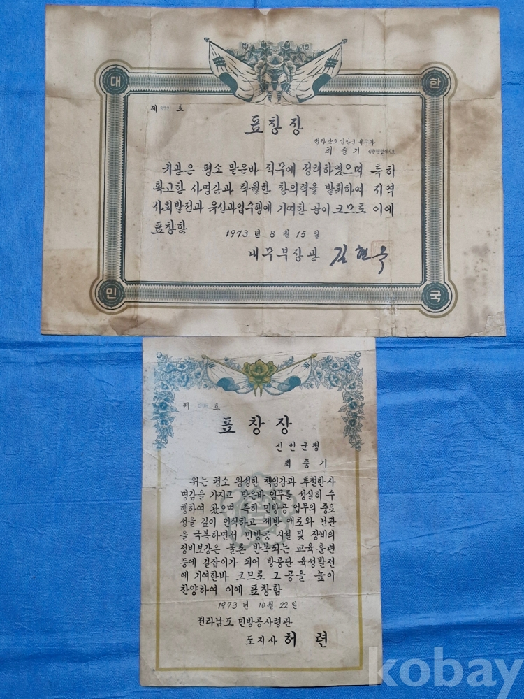 1973년 전남 신안군청 공무원에게 내려준 허련 도지사와 김현옥 내무부장관의 표창장 2점 입니다