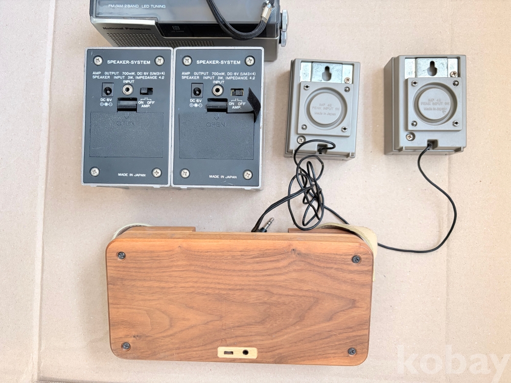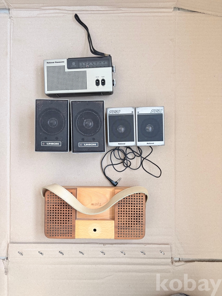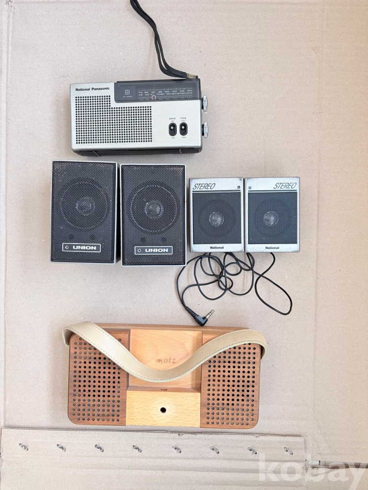 일본 전자제품의 전성기를 보여주는 '내셔널 파나소닉(National Panasonic) RF-527' 휴대용 라디오를 중심으로 한 소형 기기 4종 일괄 출품입니다.