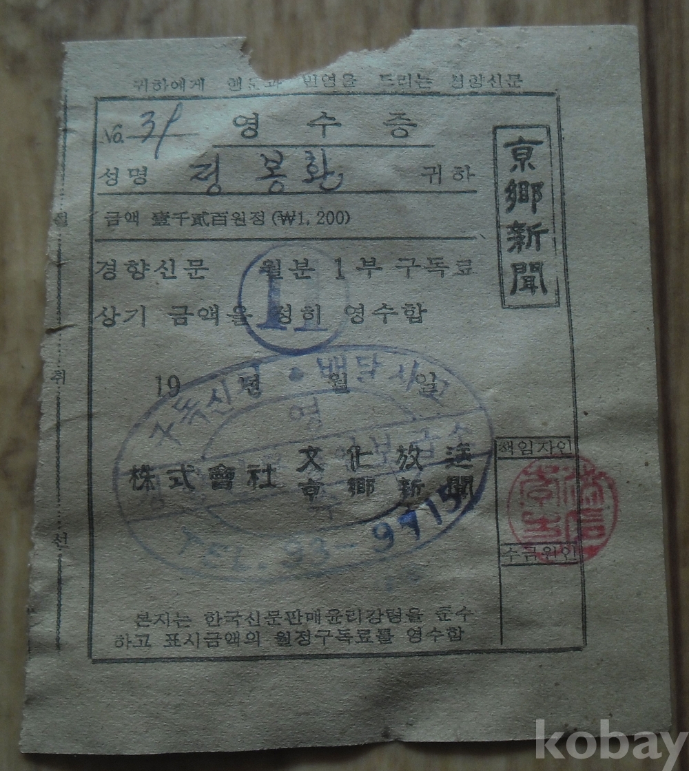1200원 시기 경향신문 구독료 영수증