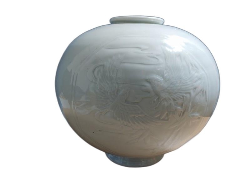 연꽃과 학, 대나무 문양이 양각으로 표현된 달 도자기 입니다.