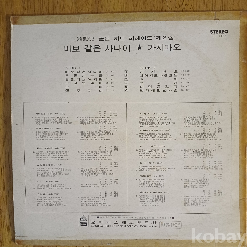 | 자켓상태 | EX : 약간의 마모, 모서리 찢김 존재 | 음반상태 | EX : 재생에 영향 없는 가벼운 기스 존재 | 발매정보 | 초반 | 가사지여부 | 무 |