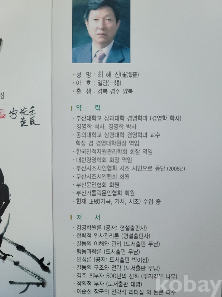 동의대학교 상경대학 경영학과 교수를 역임했던 時調 시인(崔海晋).
