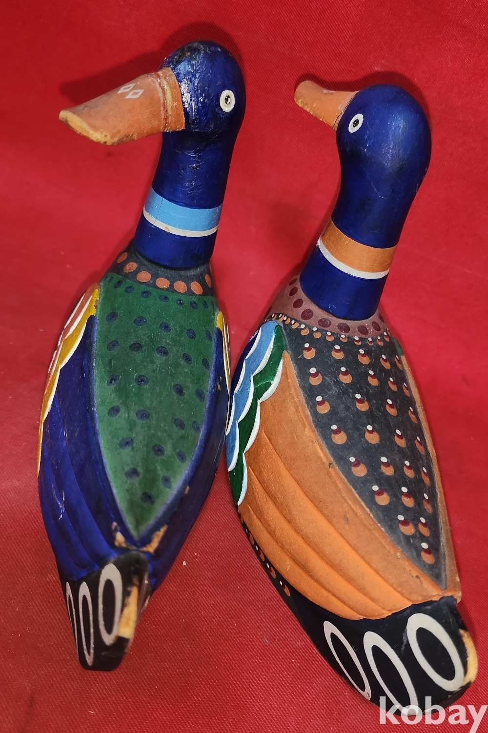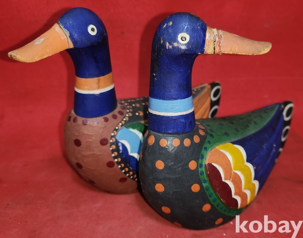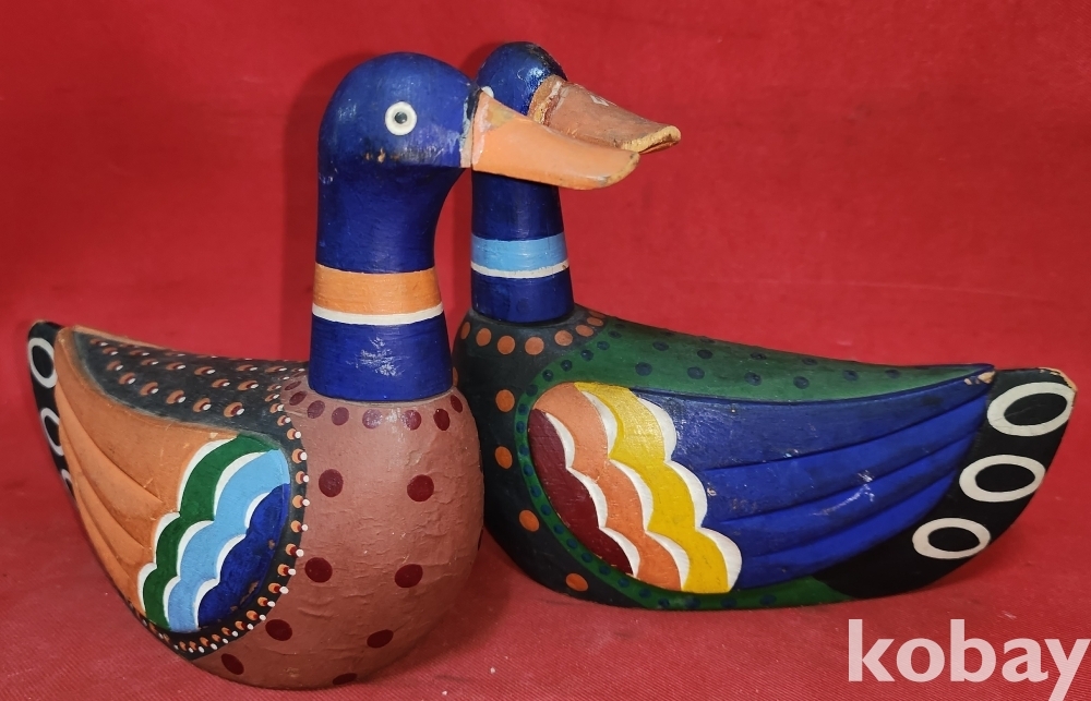 작가의 수결이 보이는 나무로 만든 원앙새 한쌍입니다,