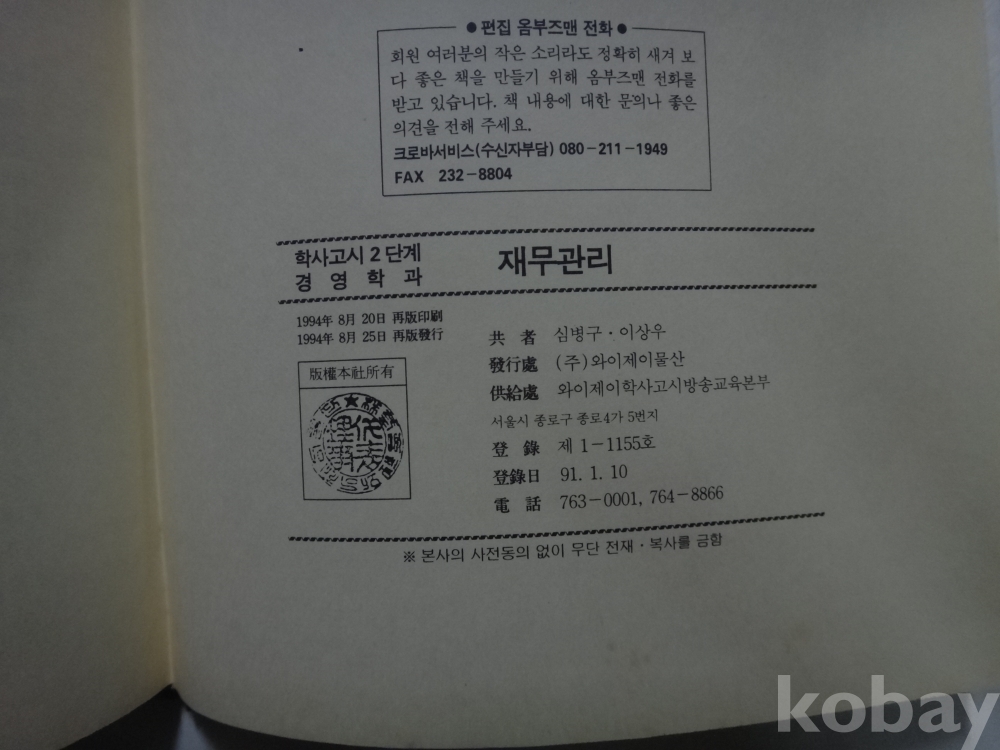 재무관리 - 학사고시2단계, 경영학과 (1994년, 심병구.이상우 공저 저, 와이제이물산 발행)
