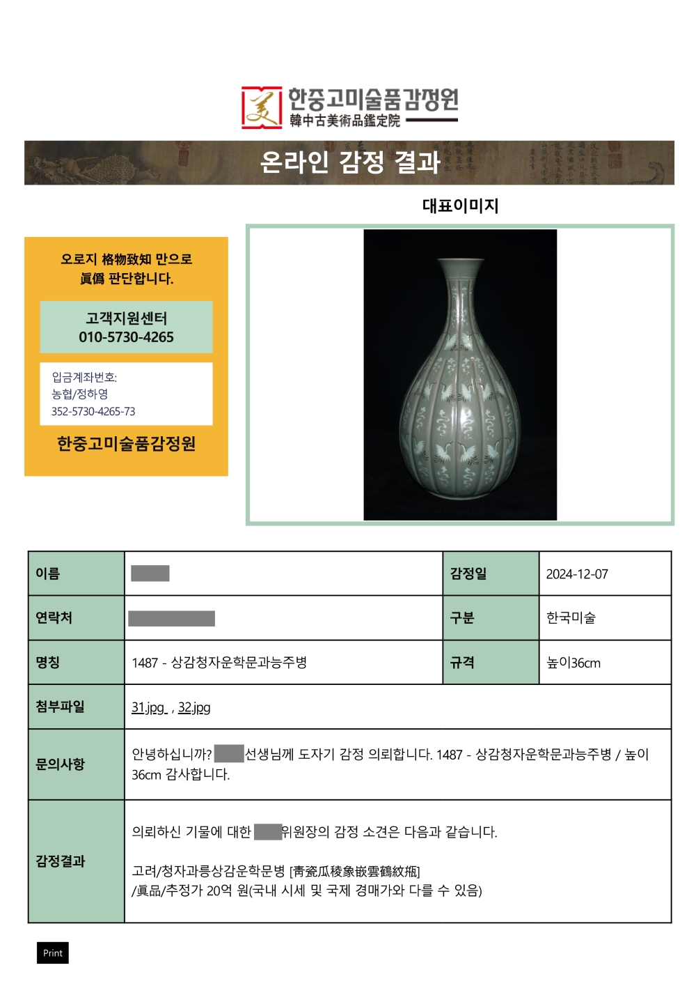 하시기 바랍니다. 또 온라인 감정 결과도 올려드렸는데, 대단히 높은 평가를 받았으며, 우리 유물이 이정도는 가치가 있다고