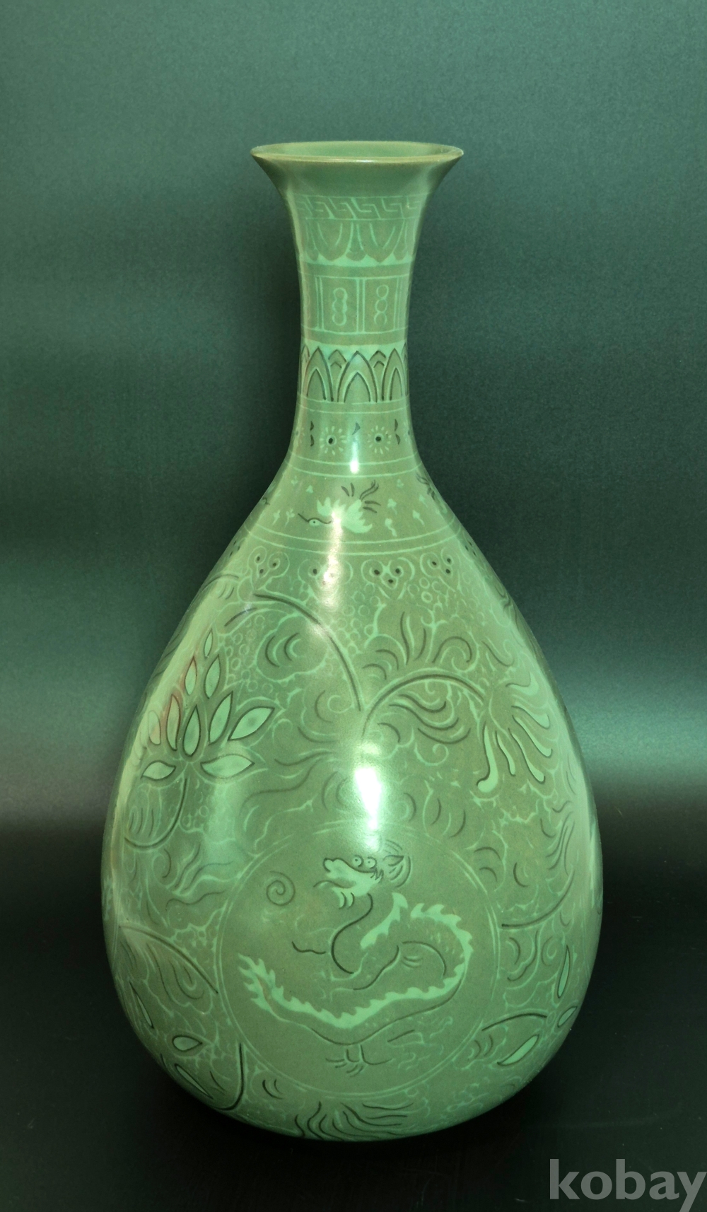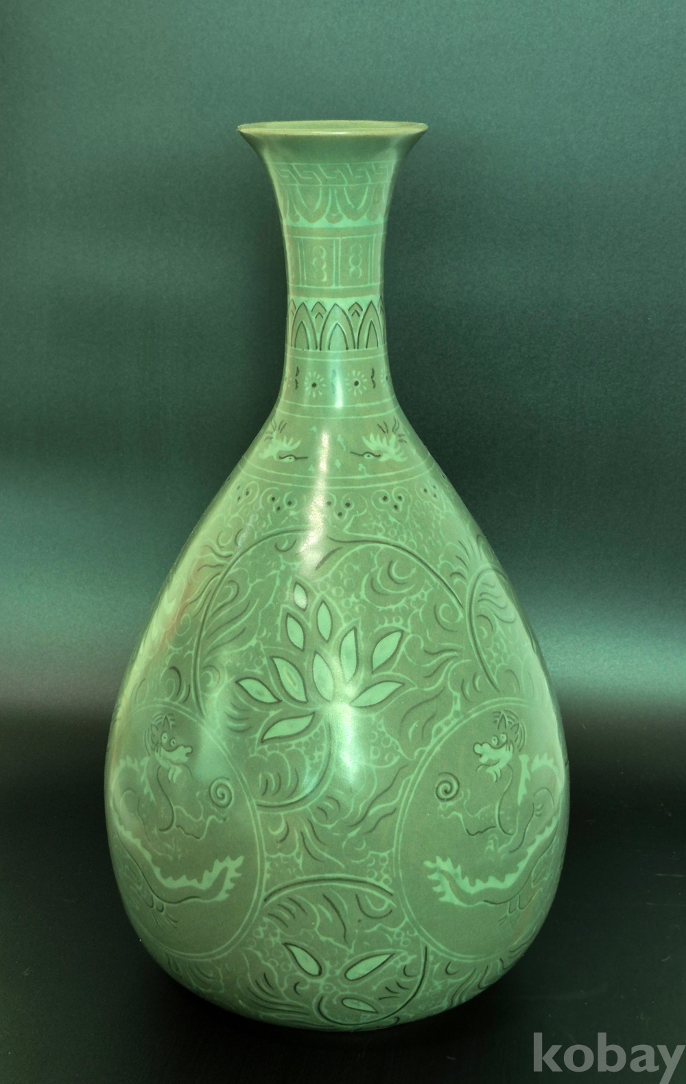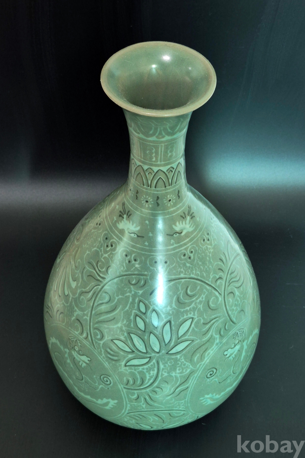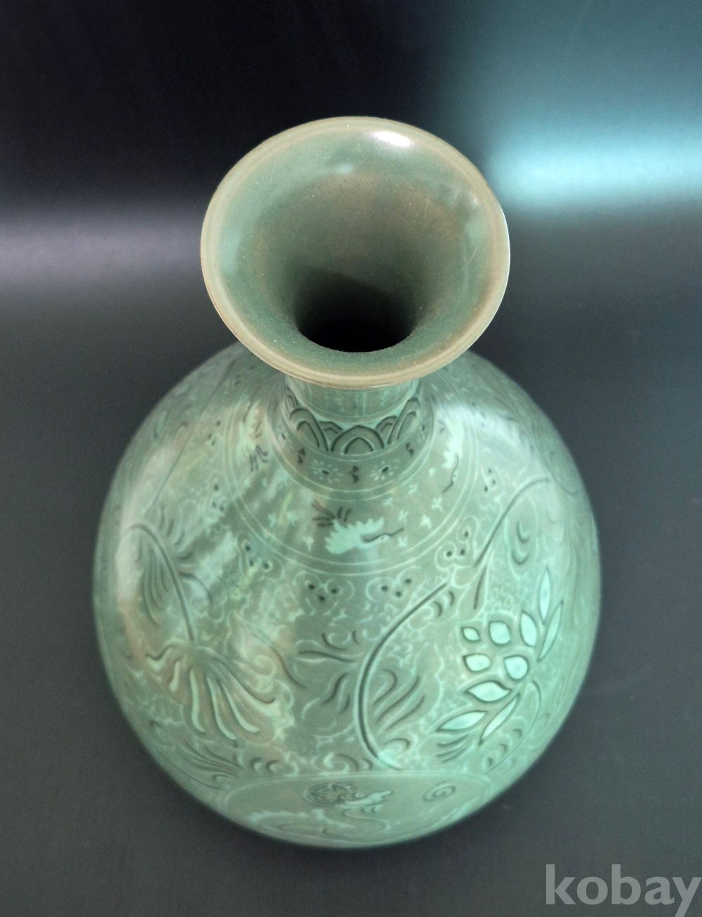 손 위에 놓고 희롱하고 있으며, 전신에 당초문이 그려져 있고 목에는 엽문, 학문, 여의두문, 국화문까지 층층히 그려져 있는 정성이 넘치는 수준 높은 고려 청자 예술품 입니다.