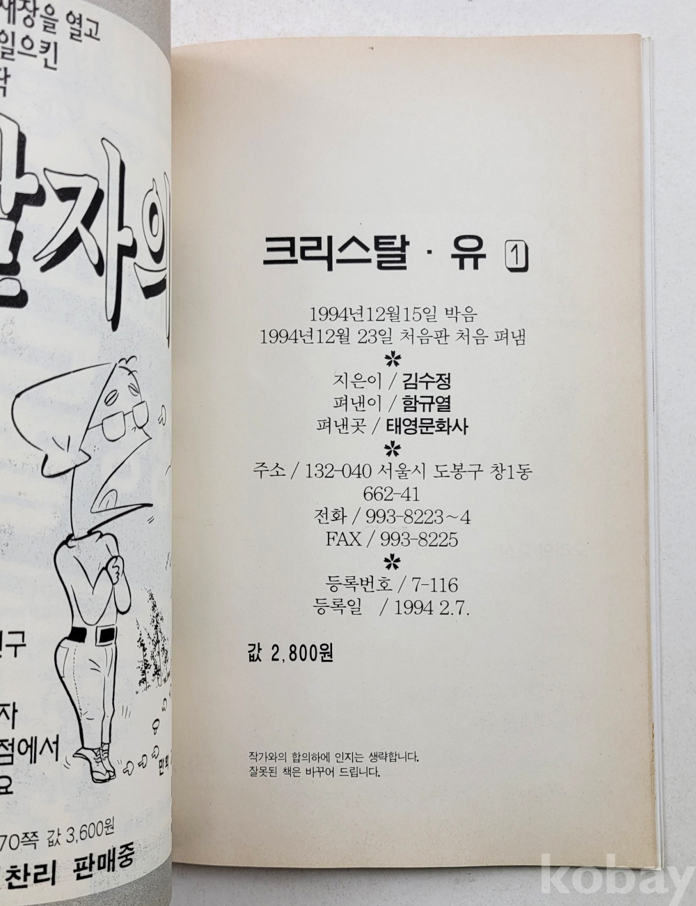 물 품 명 | 저자서명본 / 김수정 / 크리스탈 • 유 (1) / Comic X / 1994년 초판 / 태영문화사 |