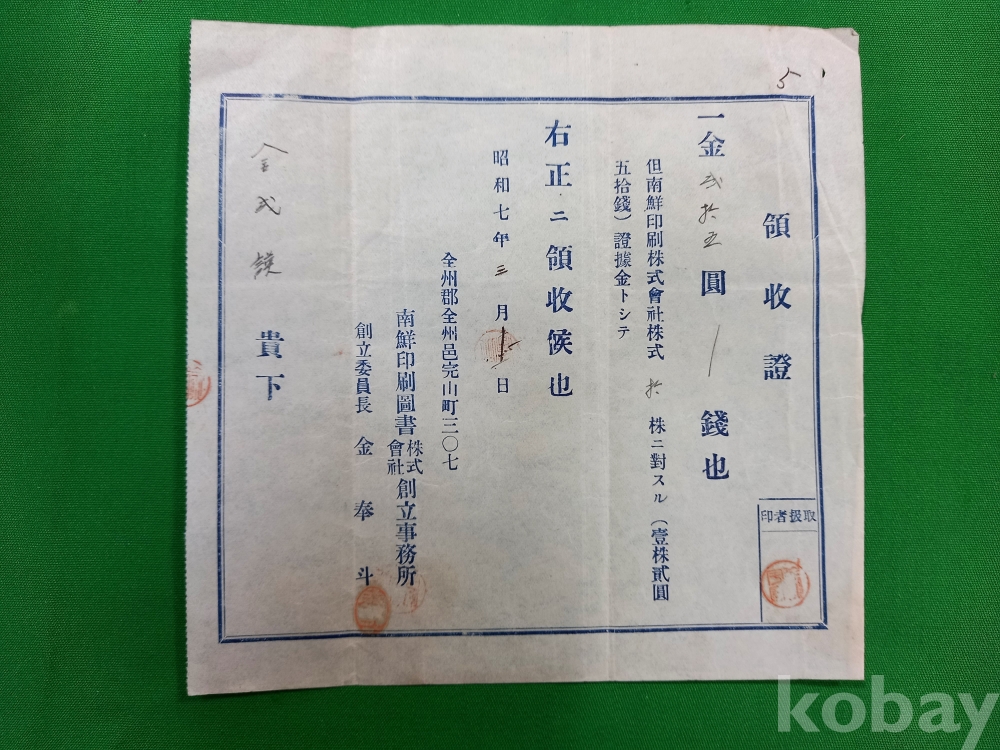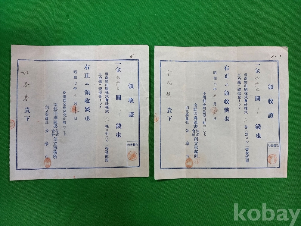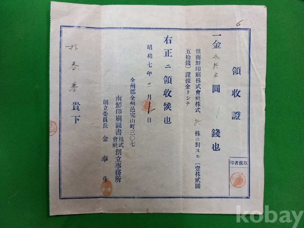 이는 단순한 영수증을 넘어 당시 전주 지역에서 출판 및 도서관 설립을 위해 주식 모집이 이루어졌음을 시사하는 중요한 근현대 금융 및 역사 유물입니다.