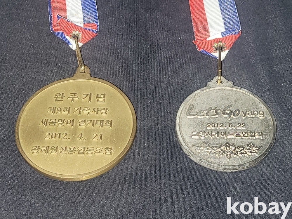 2012년 걷기대회 동메달과 주석 재질 2012년 고양시 게이트볼 메달 2종 일괄입니다.