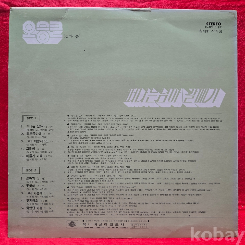 | 자켓상태 | EX : 약간의 마모, 모서리 찢김 존재 | 음반상태 | EX : 재생에 영향 없는 가벼운 기스 존재 | 발매정보 | 초반 | 가사지여부 | 유 |