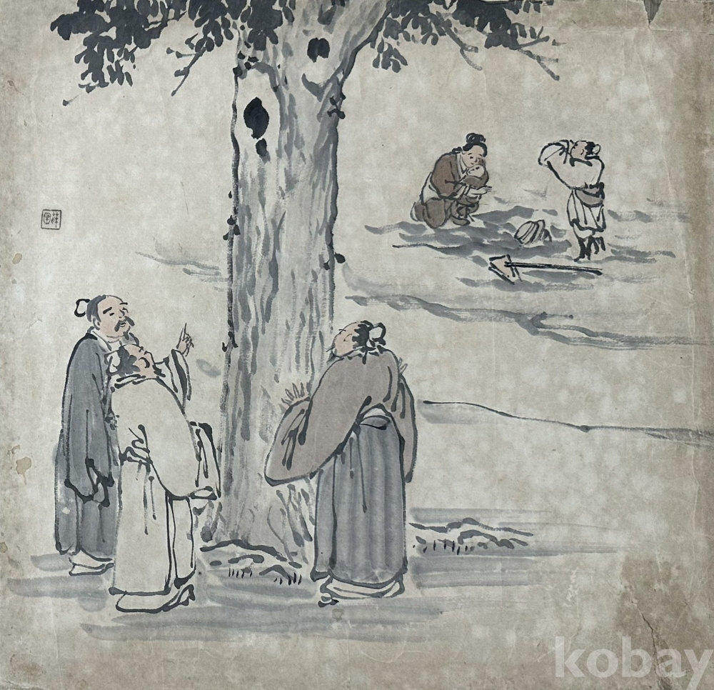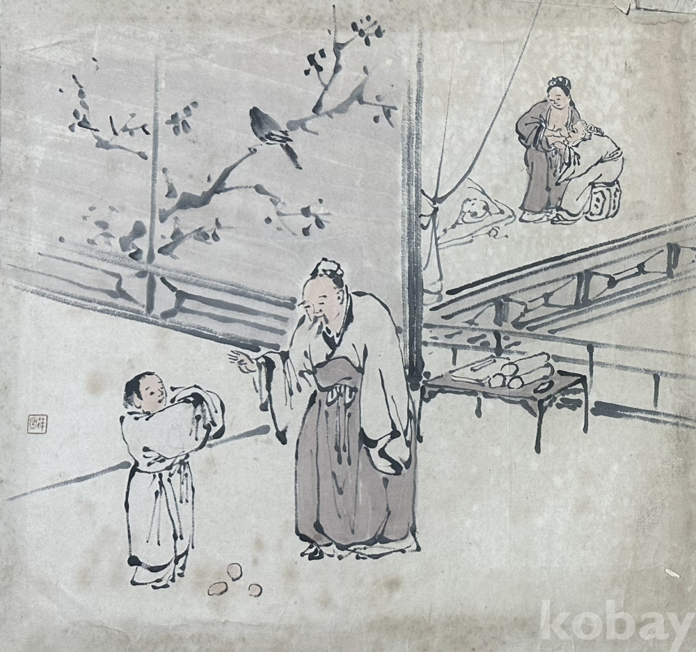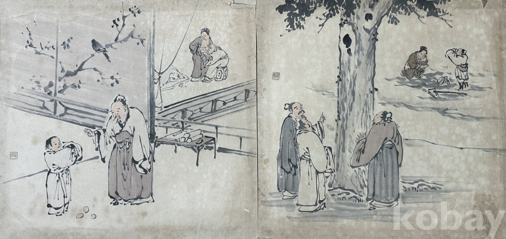 본 작품은 동양 전통 풍속 장면을 주제로 제작된 수묵 인물화 2점 구성 작품이다. 일상 속 인물들의 대화 장면과 야외 풍경을 중심으로 구성되어 있으며, 간결하면서도 생동감 있는 필선과 담채 기법을 통해 인물의 표정과 동작이 자연스럽게 표현되어 있다. 화면 곳곳에 전통 회화 특유의 여백과 공간 분할 구도가 적용되어 있어 장식성과 회화적 완성도를 동시에 갖춘 작품이다. 종이 재질 특성상 세월에 따른 자연스러운 색 변화와 생활 흔적이 일부 존재하나 전체적인 화면 구성과 필선 보존 상태는 안정적인 편이다. 동양 인물화 컬렉션, 전통 회화 인테리어 장식용으로 적합하다.