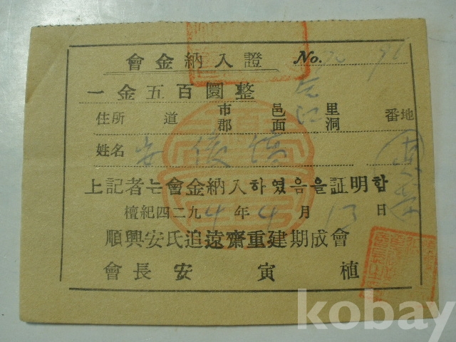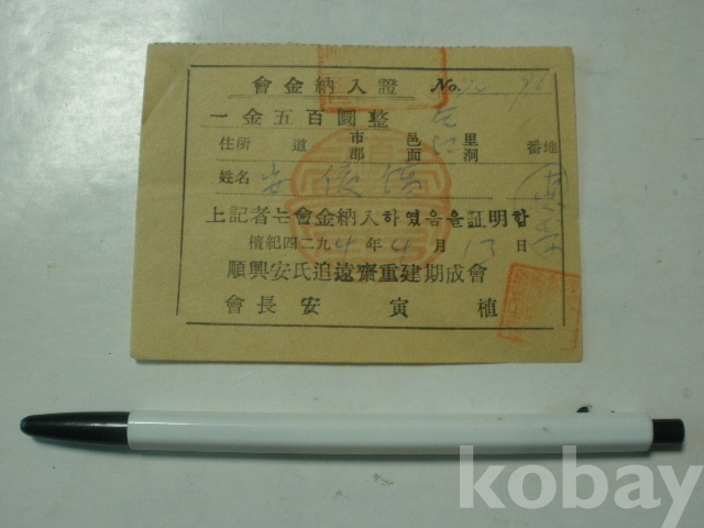 순흥안씨 추원재 중건기성회 - 회금납입증 (1961년)