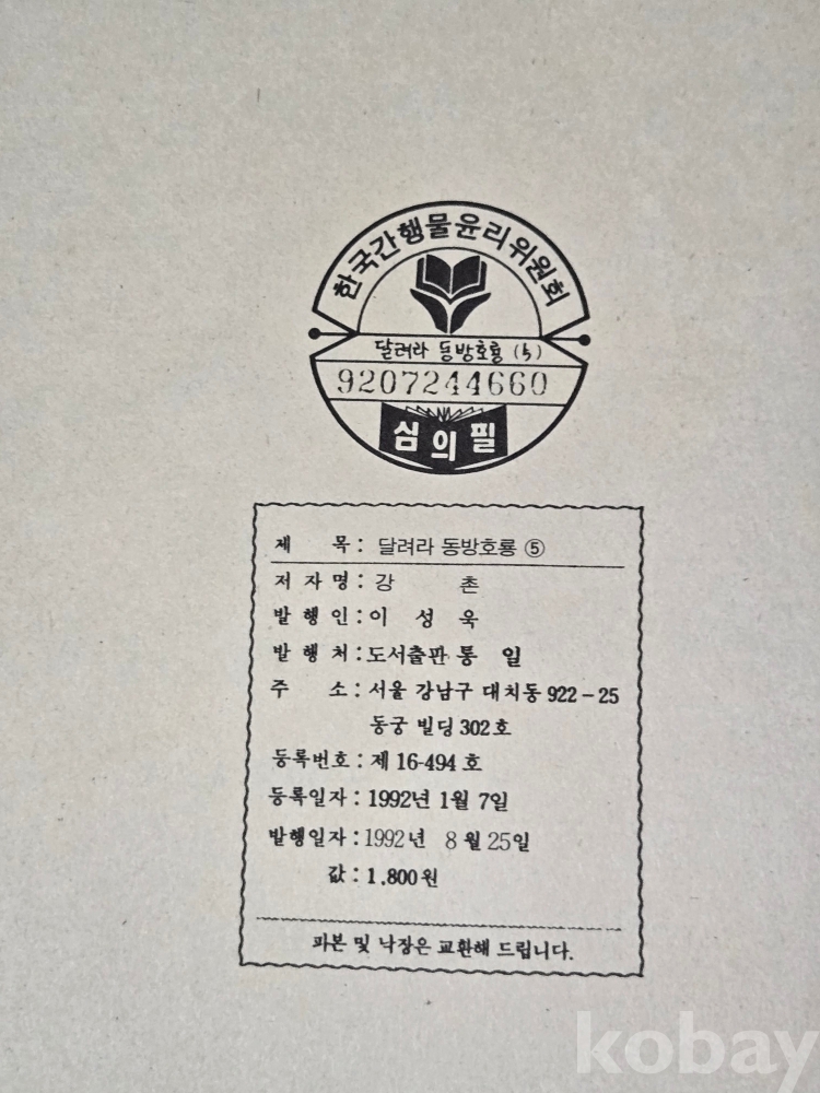 강촌 청춘극화 . 강촌 글.그림 == 달려라 동방호룡 5권 완질 == 1992년