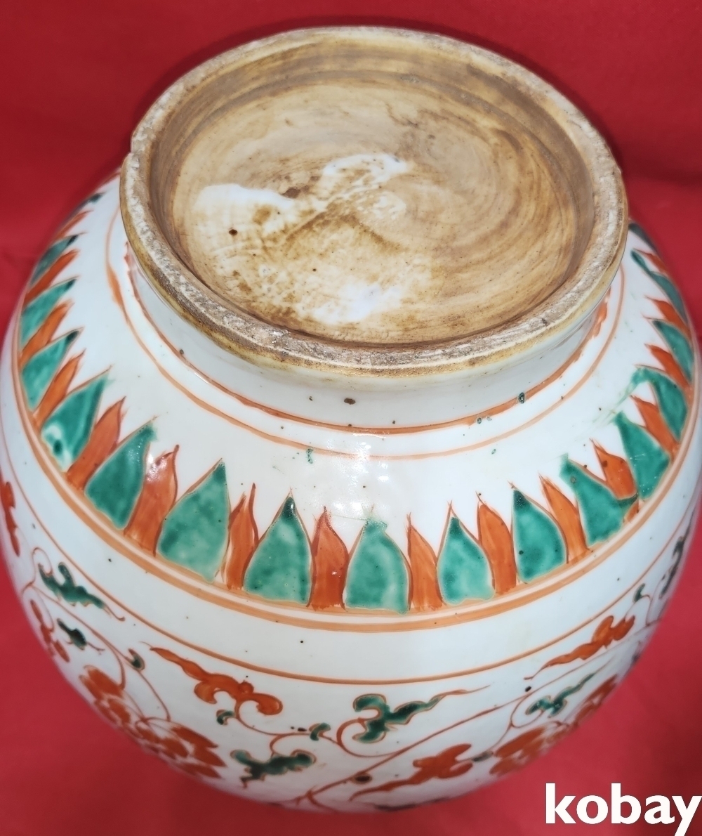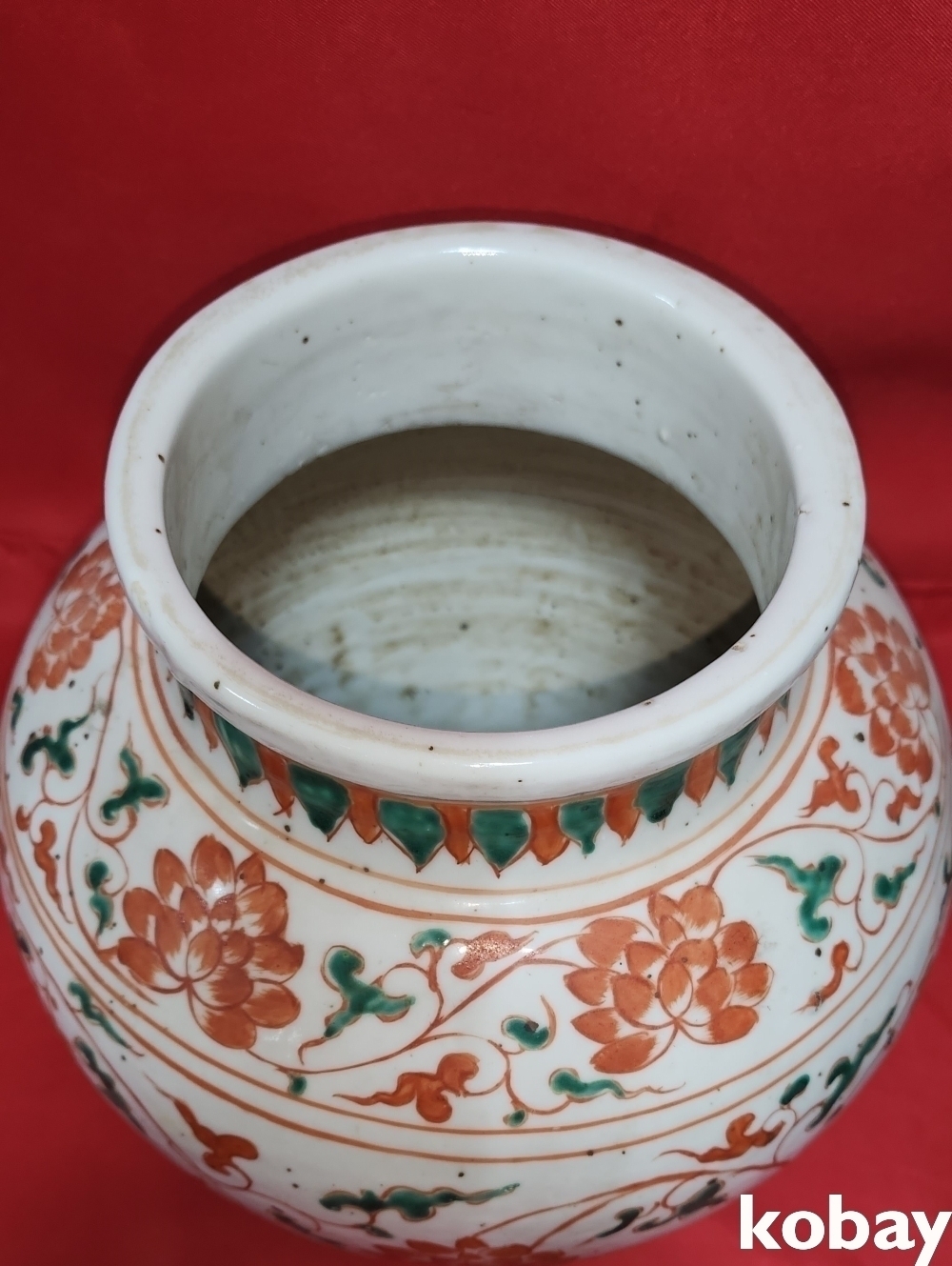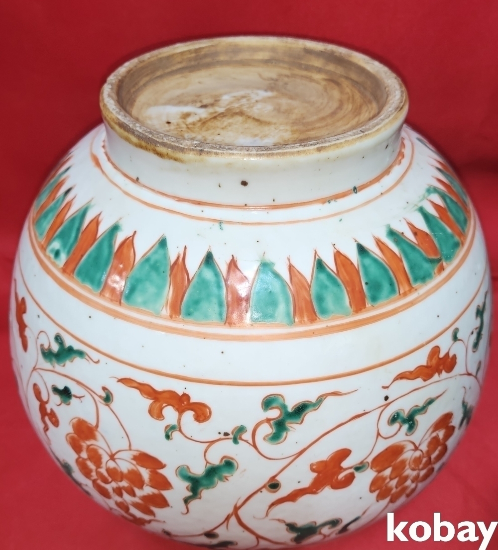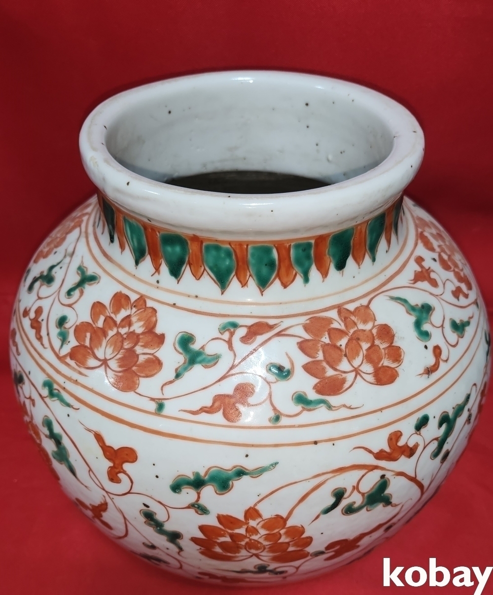 청나라 시대 연대 갖춘 청화 유리홍 화훼문양 항입니다