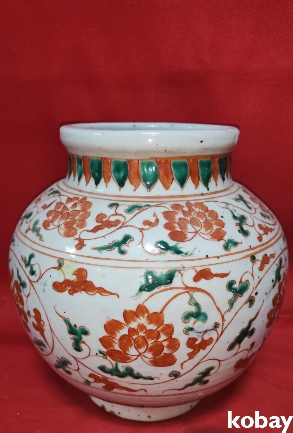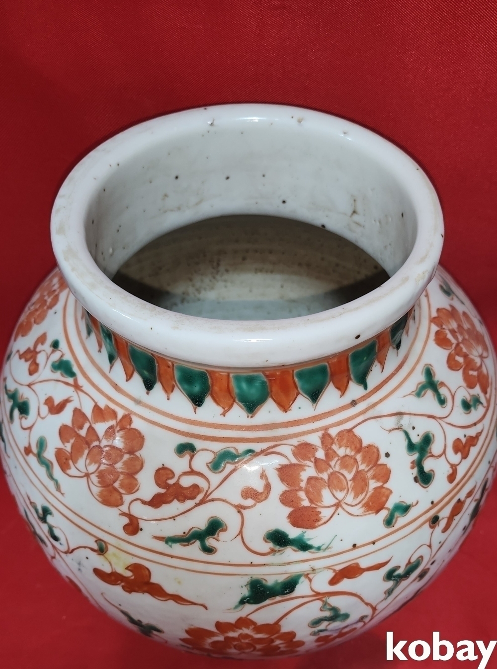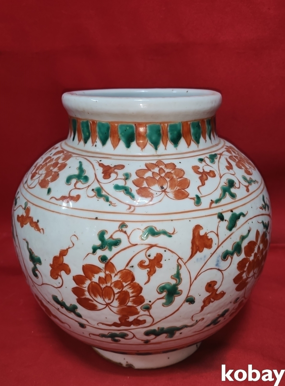 청나라 시대 연대 갖춘 청화 유리홍 화훼문양 항입니다