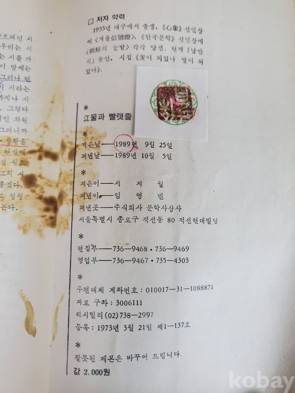 1. 강물과 빨랫줄, 서지월, 문학사상사, 1989년, 146쪽, 상태 중, 사진 참조