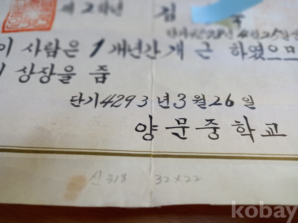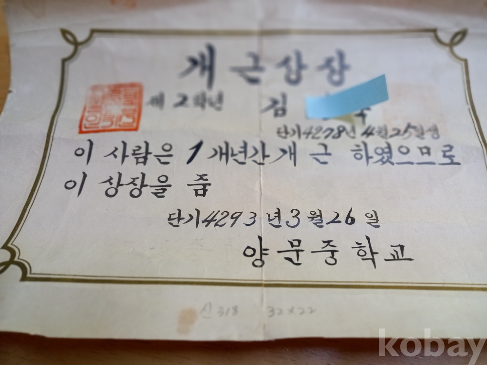 신 318) 양문중학교 개근상장 4293년