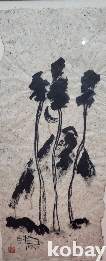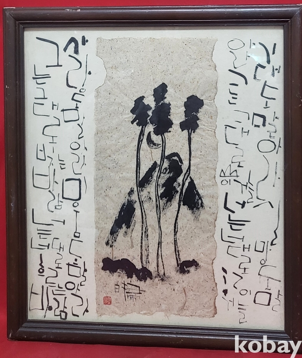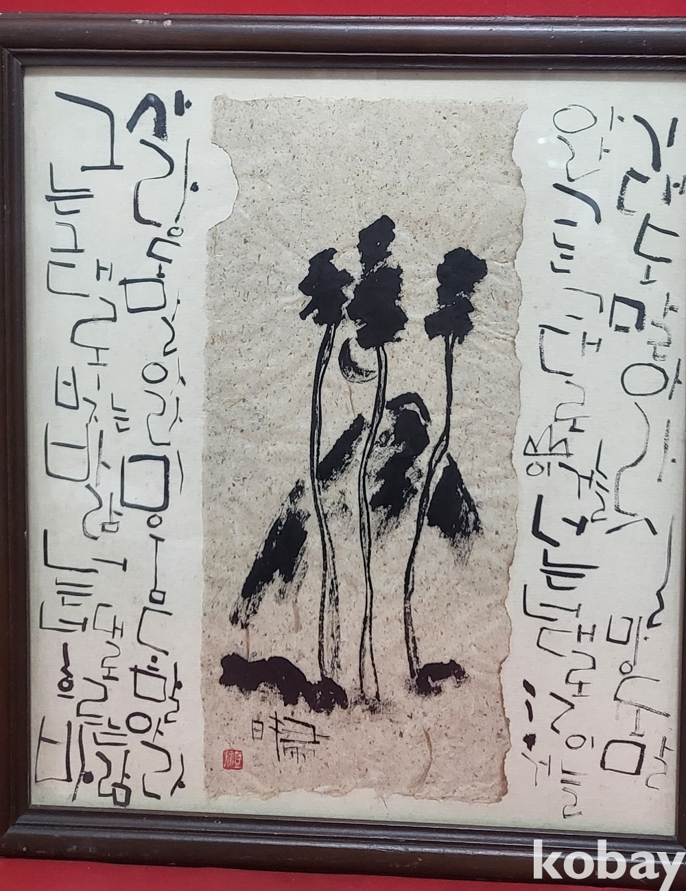 한지에 수묵화를 그리고 좌우에 시를 쓴 작품입니다,