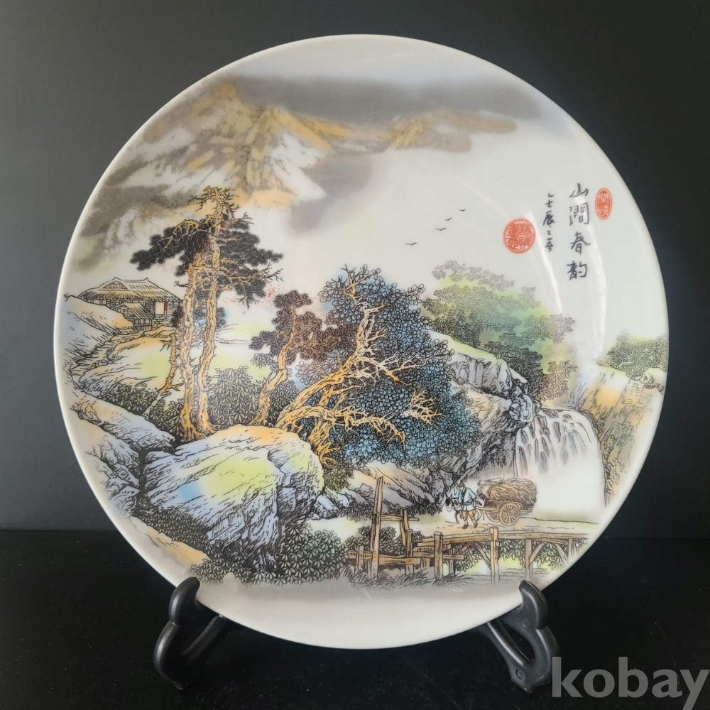 그림이 화려하게 전사된 도자기 접시입니다. 미사용 작품으로 좌대와 함께 제공되며 사이즈와 무게 모두 장식용으로 두고 보시기에 손색없는 작품입니다