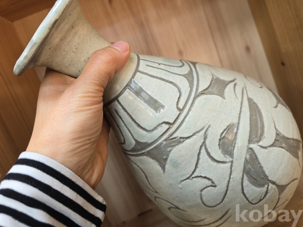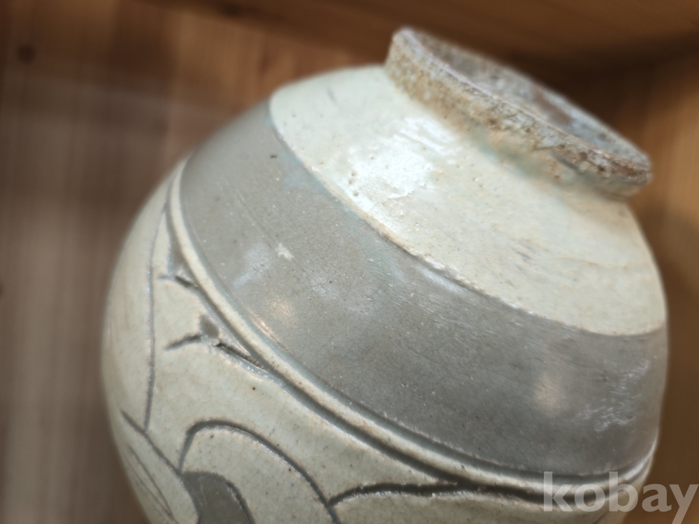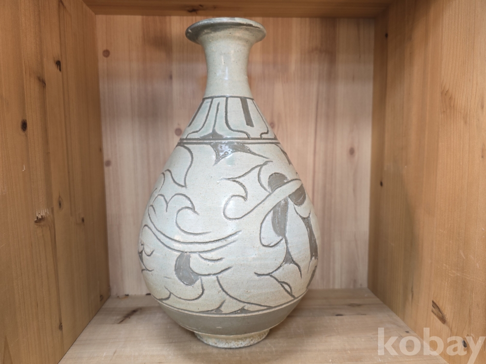 목 부분에 세로로 길쭉한 선무늬가 있고, 몸통 전체에 구름처럼 휘감은 무늬가 시원하게 펼쳐져 있어요.