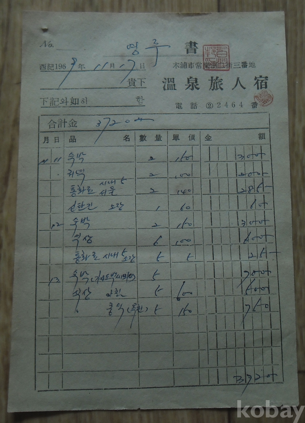 1969년 목포 온천여인숙 발행 계산서