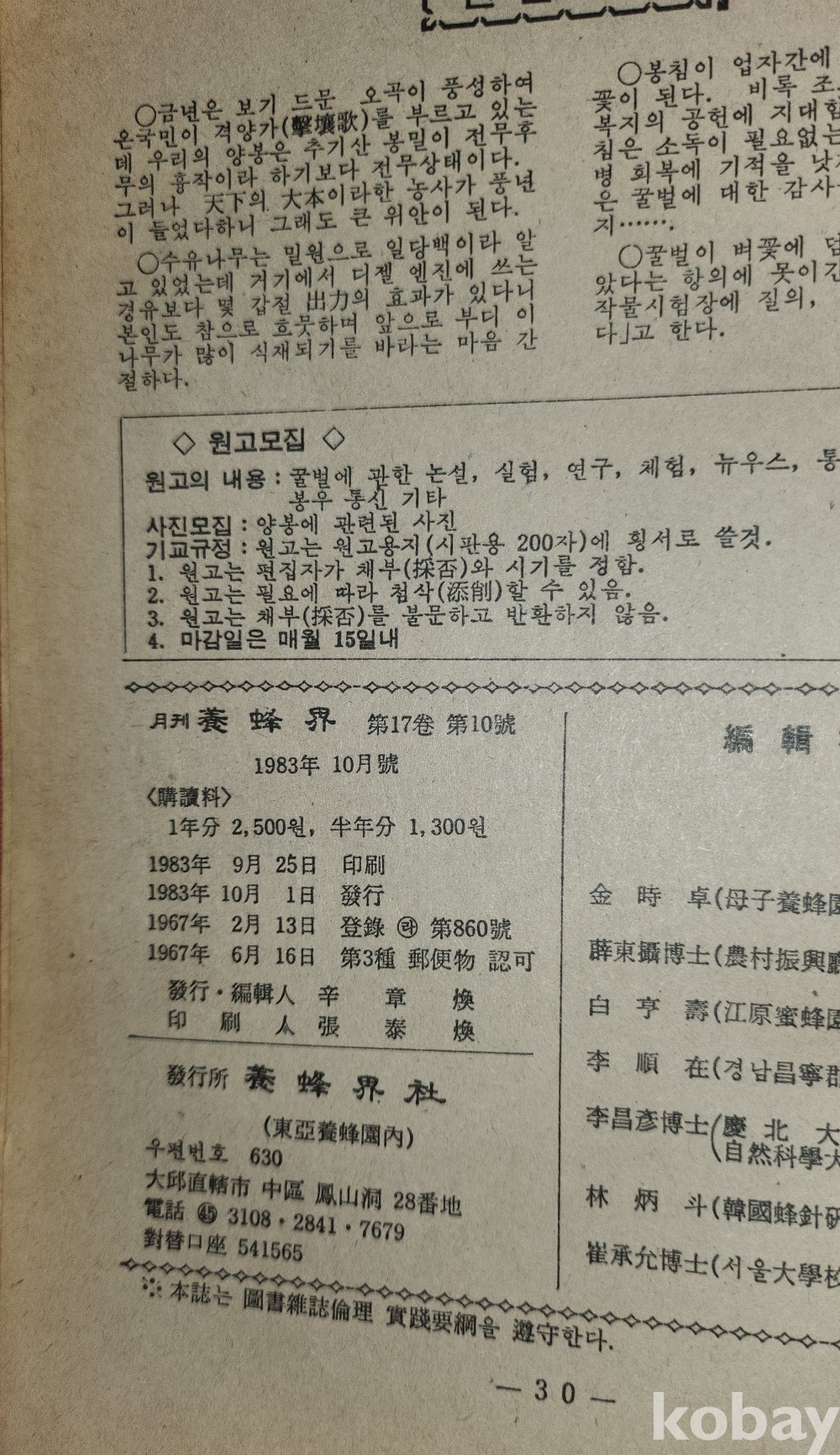1983년에 발행된 양봉계(養蜂界) 양봉계사 발행10 월호입니다,
